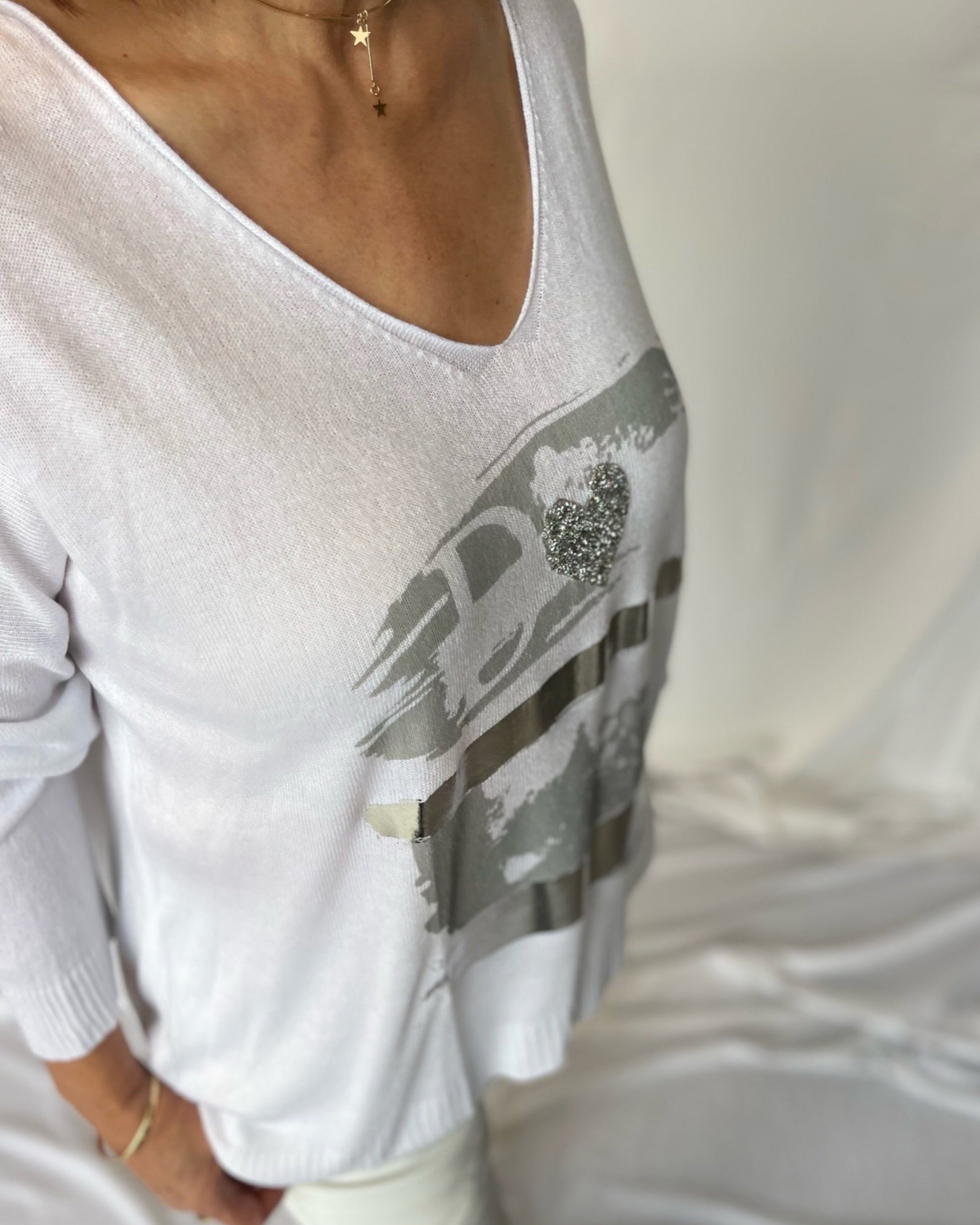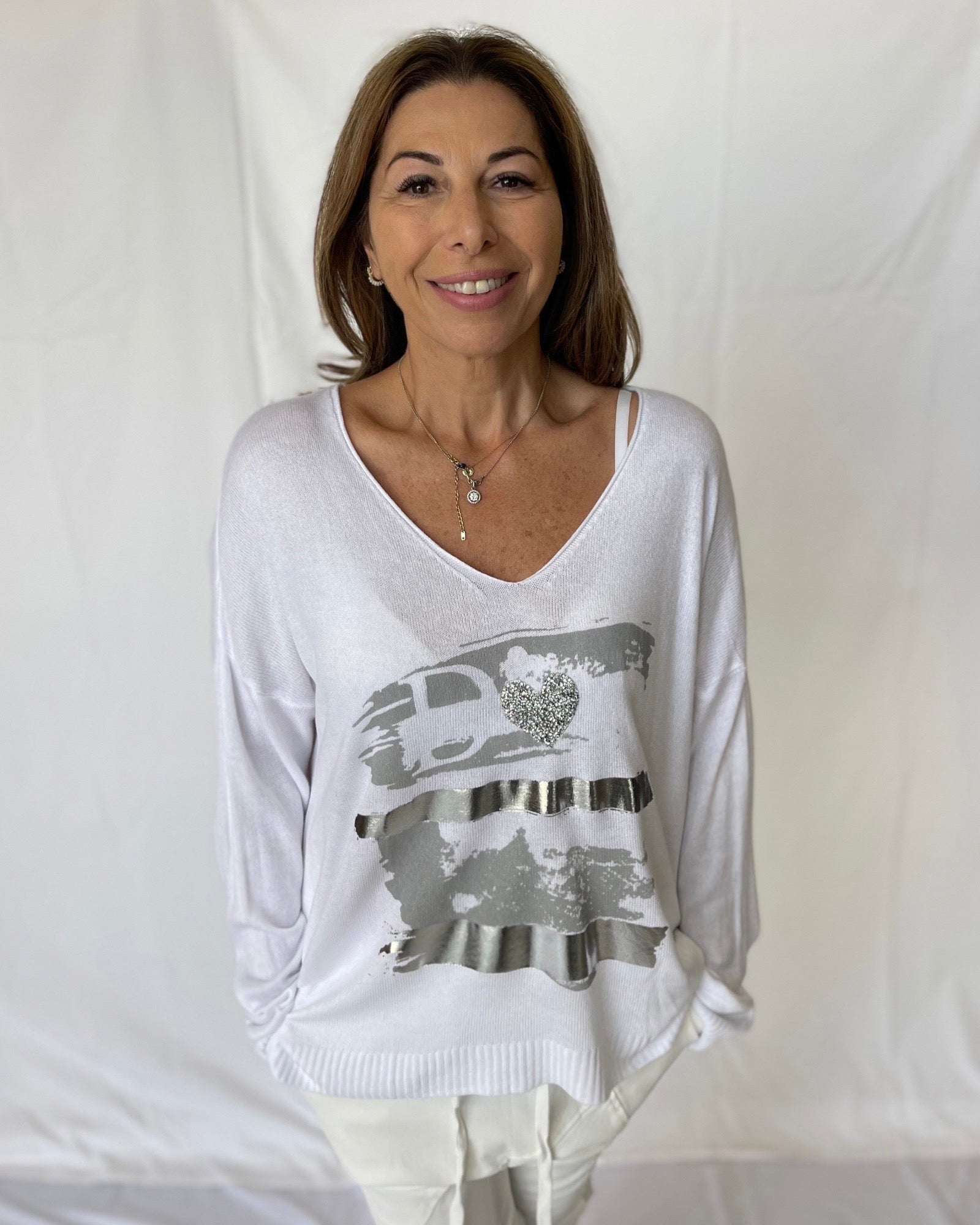 Welcome this Light Knit to your closet! This fun, oversized top is made of a super soft modal blend knit, perfect for your spring wardrobe. The Silver Heart Motif adds a touch of sweetness. Snuggle up in style with this cozy piece!