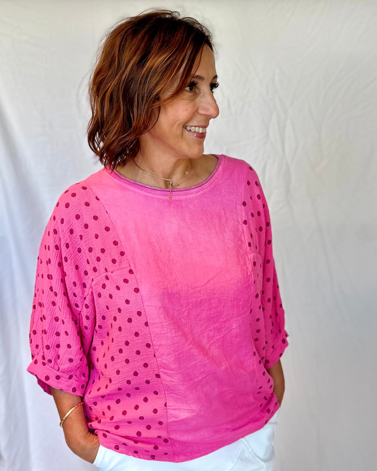 Experience effortless styling and relaxed elegance this summer with the Spot Top. Crafted from a lightweight blend of Linen and Cotton, this statement piece features a relaxed fit, 3/4 length sleeves, and a flattering boat neck. The eye-catching spotted print is available in multiple glorious colours, perfect to pair with white pants for a summery look.
