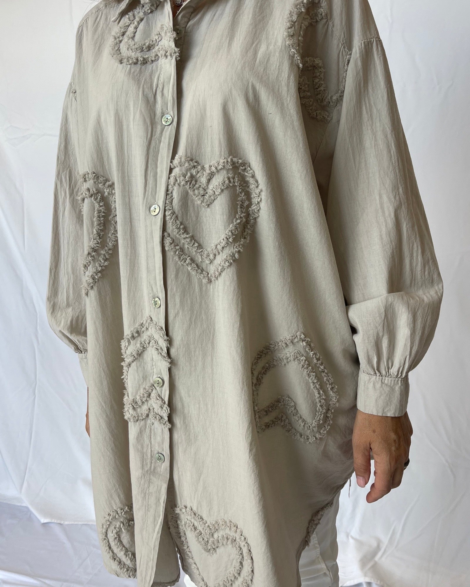 Indulge in effortless elegance with our Oversized Cotton Heart Shirt. Designed with unique heart stitch detailing, this chic collared shirt exudes luxury and timeless style. Crafted from cotton it features a button down design and all-over embroidered hearts. The long-line length and split hem add a versatile touch to this exquisite piece.