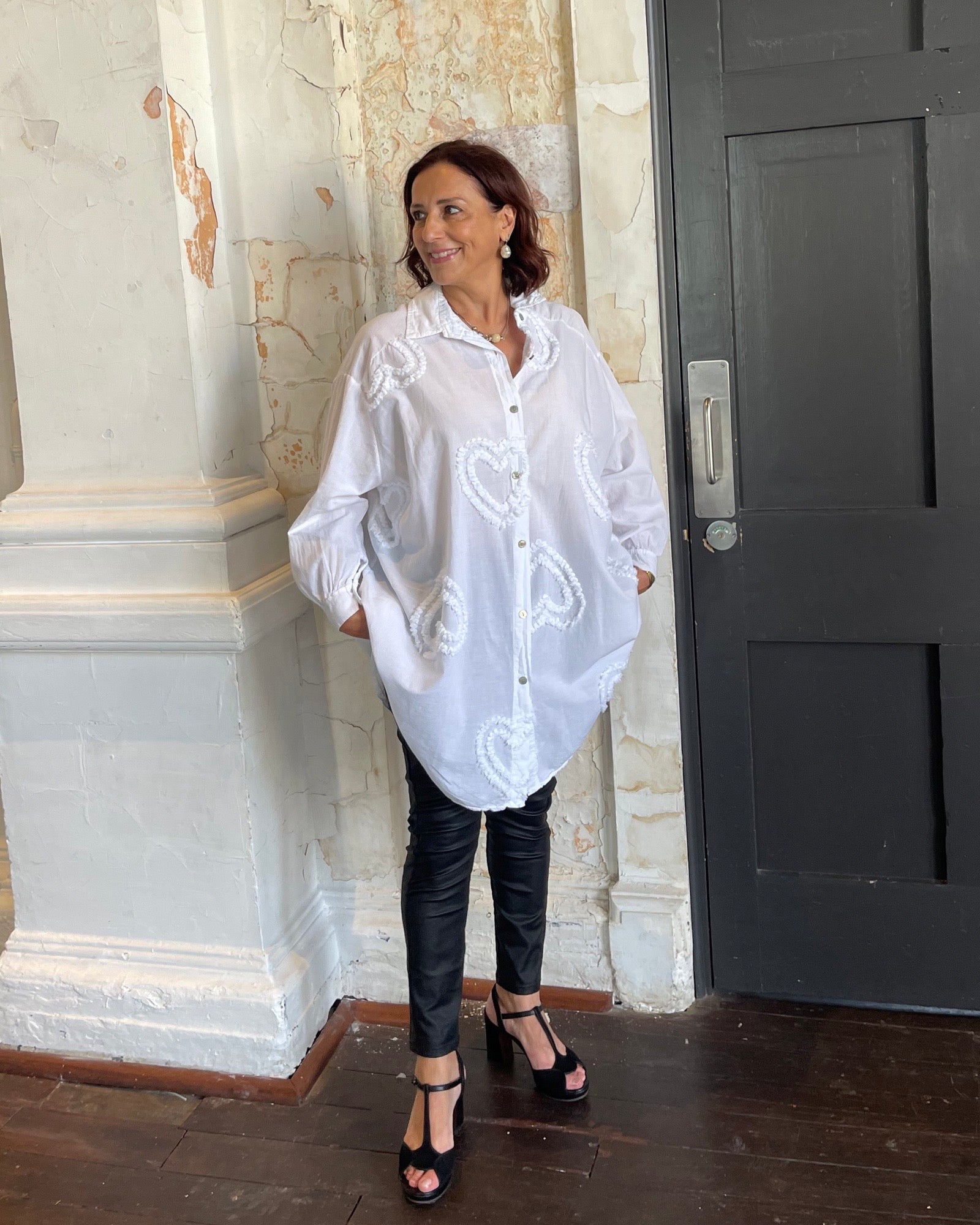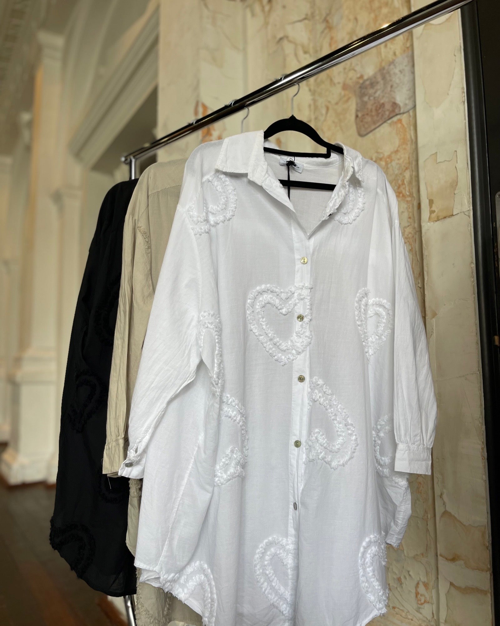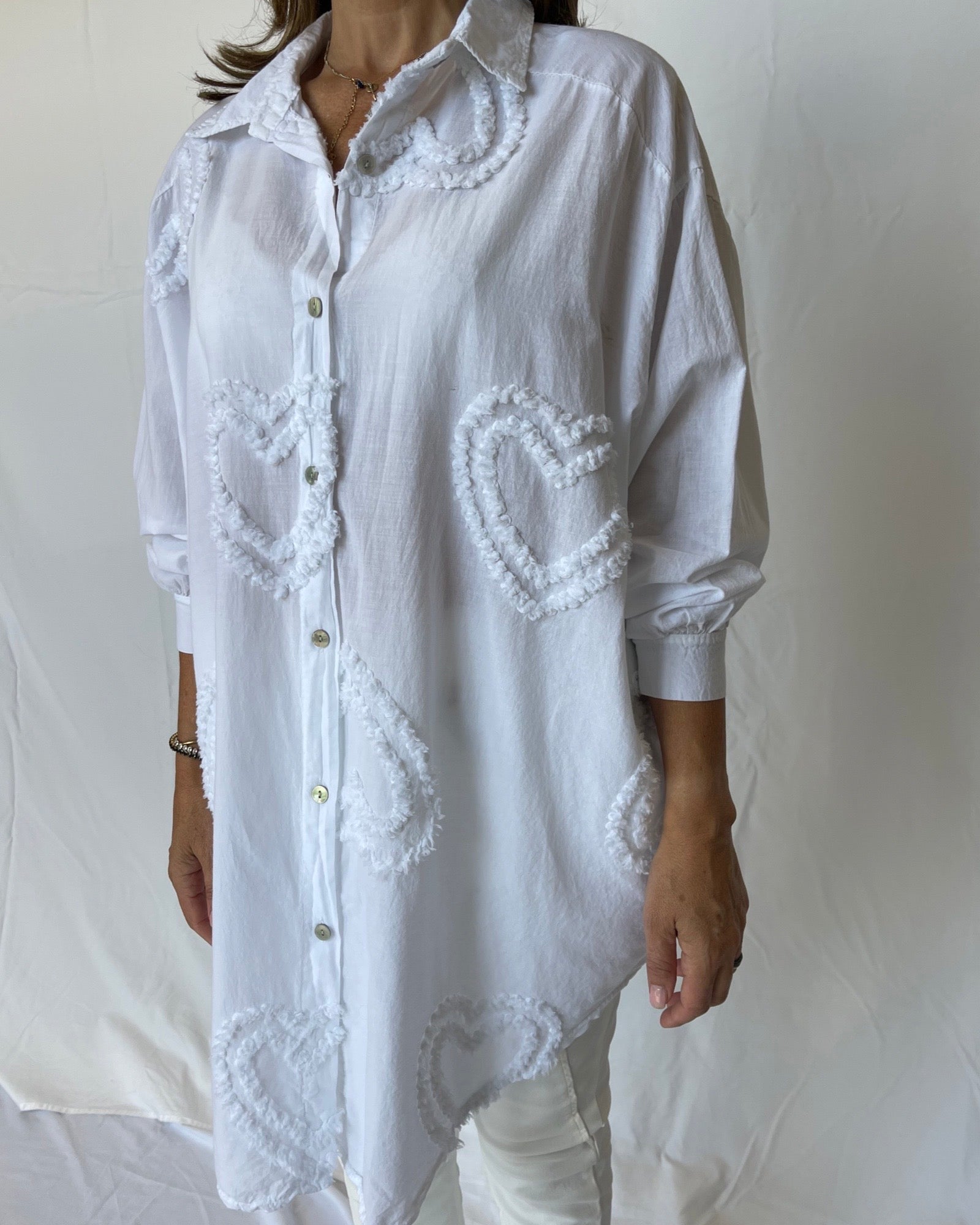 Indulge in effortless elegance with our Oversized Cotton Heart Shirt. Designed with unique heart stitch detailing, this chic collared shirt exudes luxury and timeless style. Crafted from cotton it features a button down design and all-over embroidered hearts. The long-line length and split hem add a versatile touch to this exquisite piece.