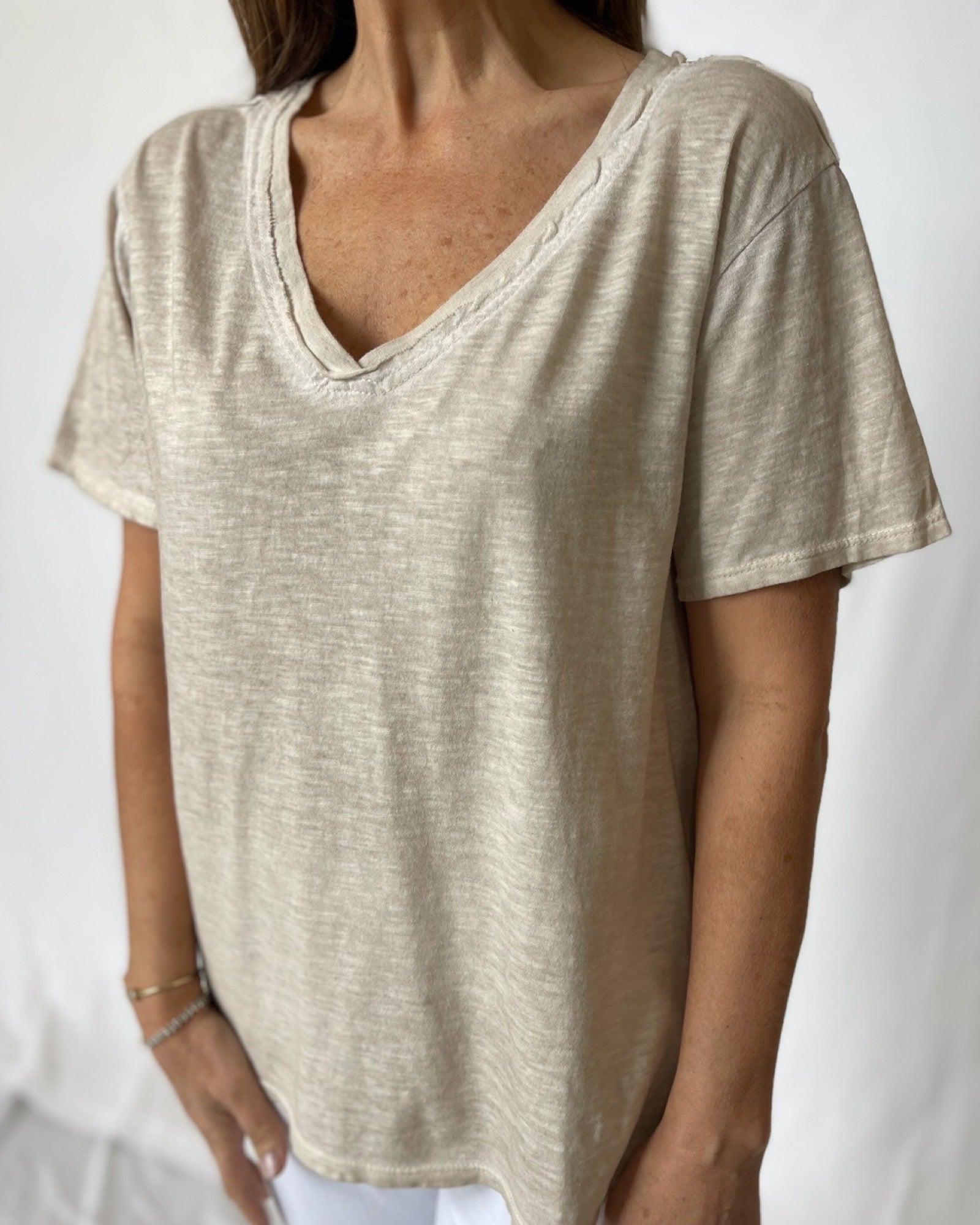 This cotton V neck tee is the perfect addition to any wardrobe. With its soft flowing silhouette, it's not only a versatile wardrobe staple, but also a great option for layering. Stay comfortable and stylish with this tee!