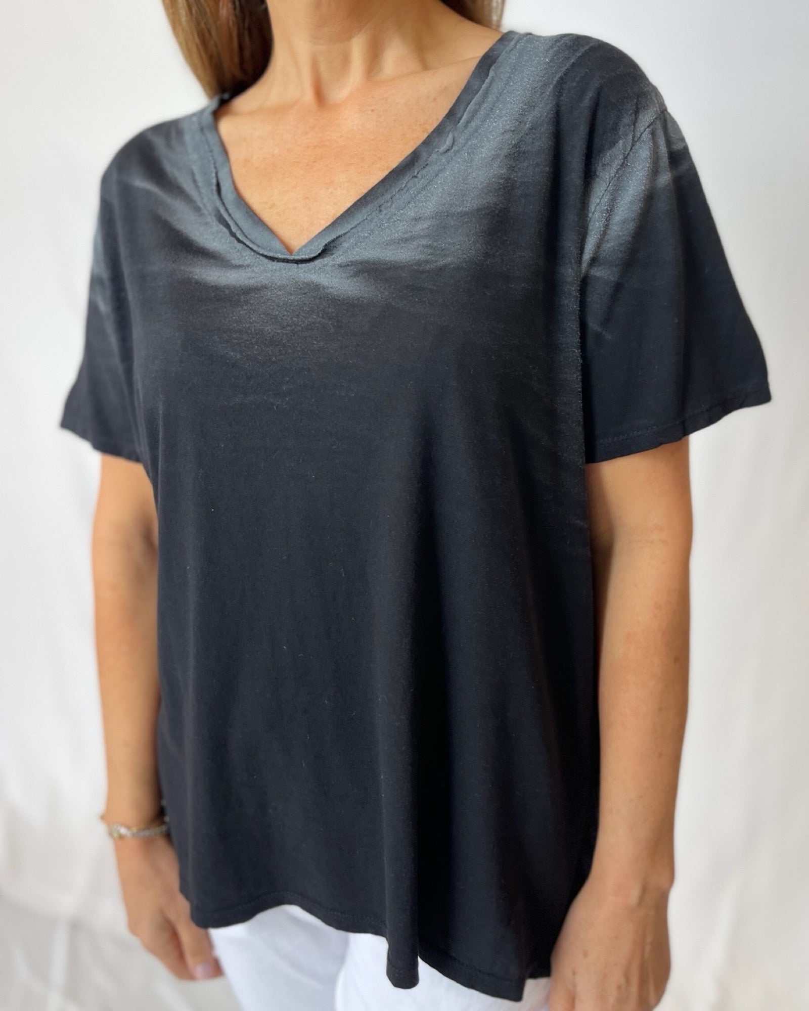 This cotton V neck tee is the perfect addition to any wardrobe. With its soft flowing silhouette, it's not only a versatile wardrobe staple, but also a great option for layering. Stay comfortable and stylish with this tee!