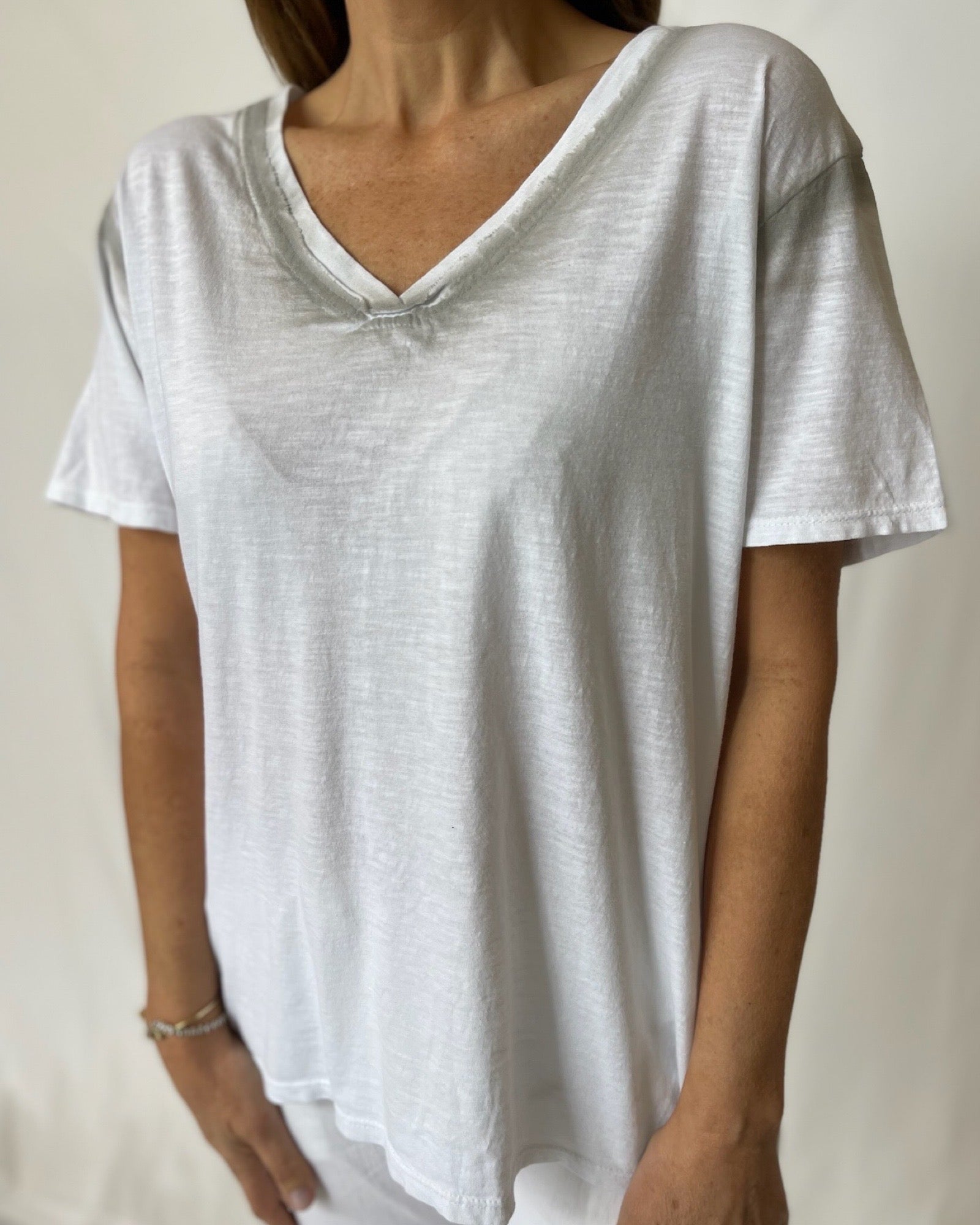 This cotton V neck tee is the perfect addition to any wardrobe. With its soft flowing silhouette, it's not only a versatile wardrobe staple, but also a great option for layering. Stay comfortable and stylish with this tee!