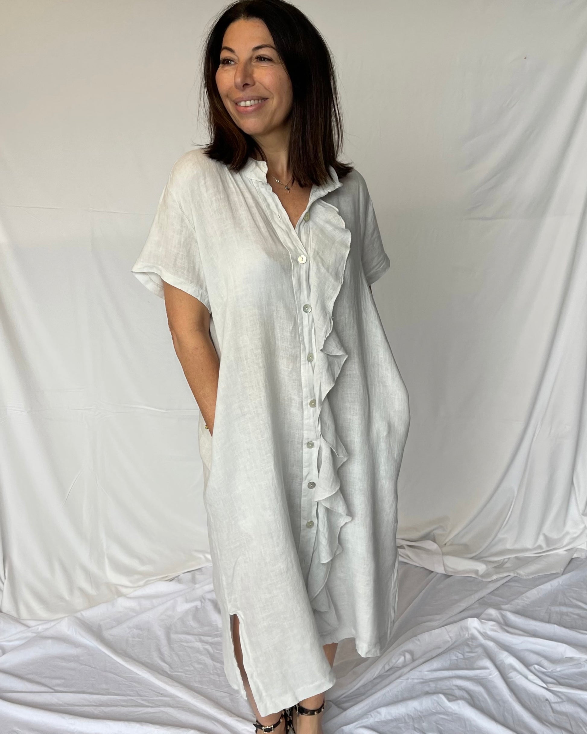This Frill Dress Linen is perfect for the modern, chic woman looking for a free flowing classic look. Crafted with a luxe linen fabric and featuring a grandpa collar, soft feminine frill button down, this dress conveys effortless sophistication. Available in classic colors, this dress is perfect for your next special event.