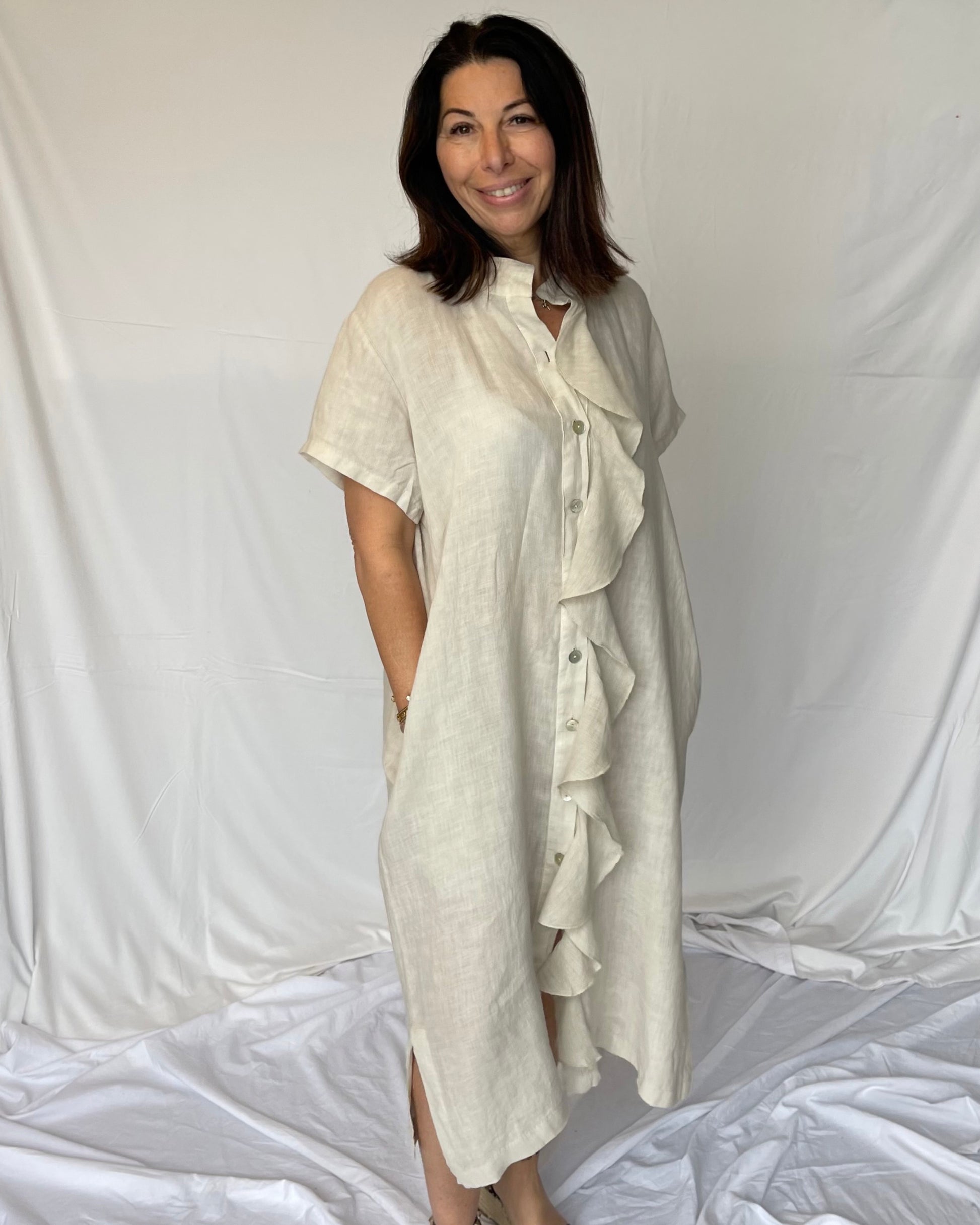 This Frill Dress Linen is perfect for the modern, chic woman looking for a free flowing classic look. Crafted with a luxe linen fabric and featuring a grandpa collar, soft feminine frill button down, this dress conveys effortless sophistication. Available in classic colors, this dress is perfect for your next special event.