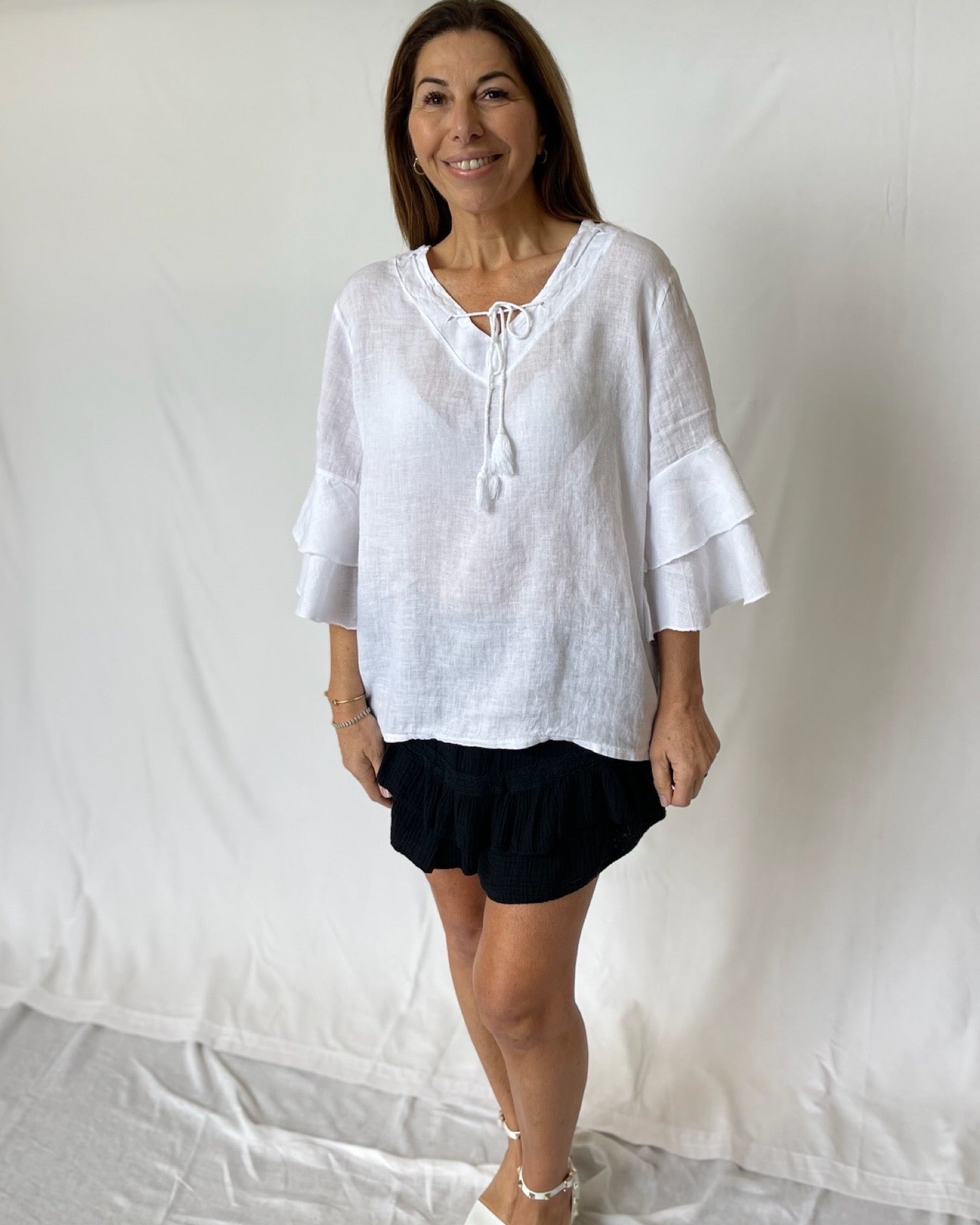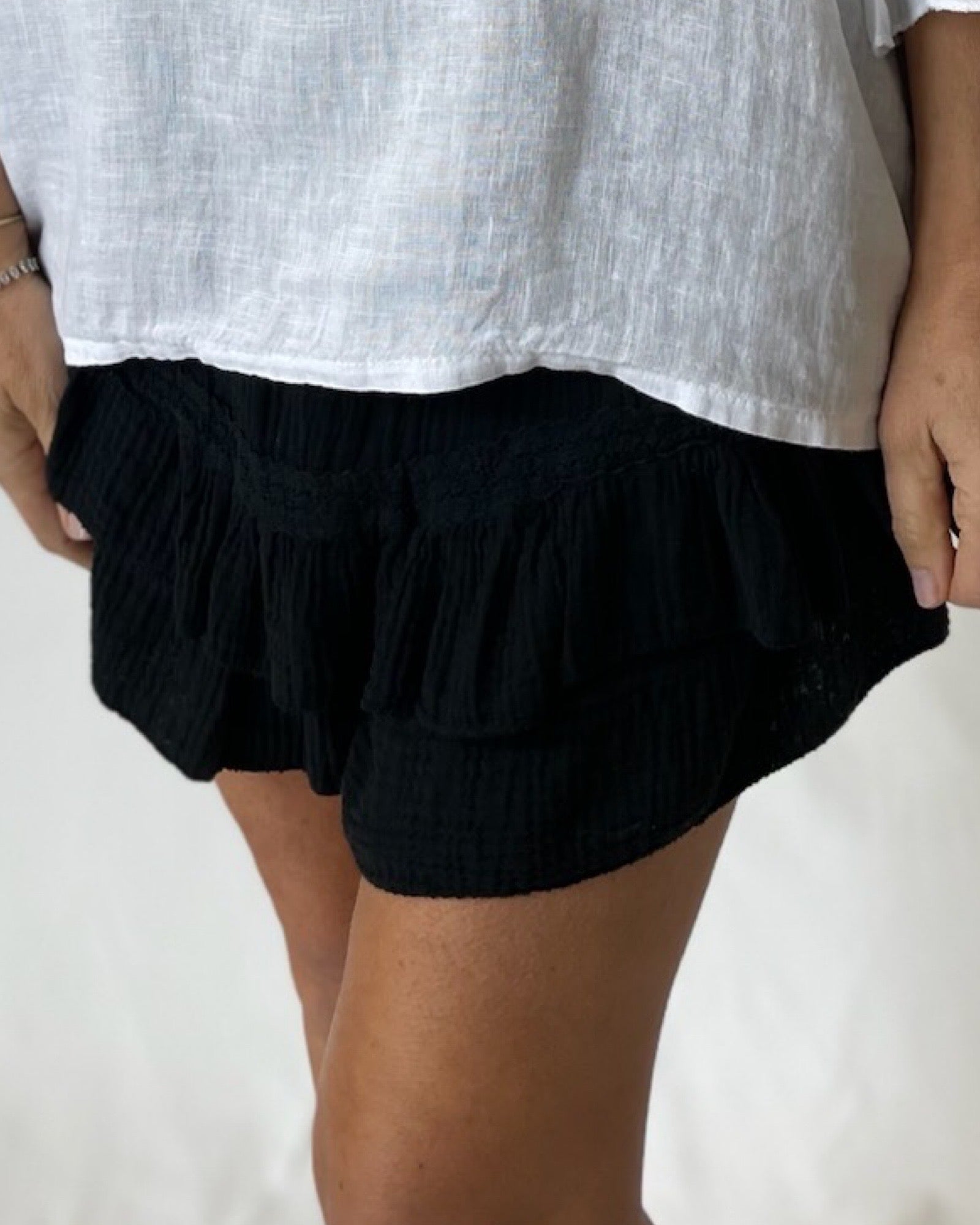 Get ready to turn heads with our Ruffle Shorts in Black! These stylish and comfortable shorts are a beloved staple that you'll reach for season after season. With an elasticated waist, they're the perfect choice for hot summer days or a tropical getaway. Don't miss out on this must-have item! Paired with our Linen Frill Top!!                         Â