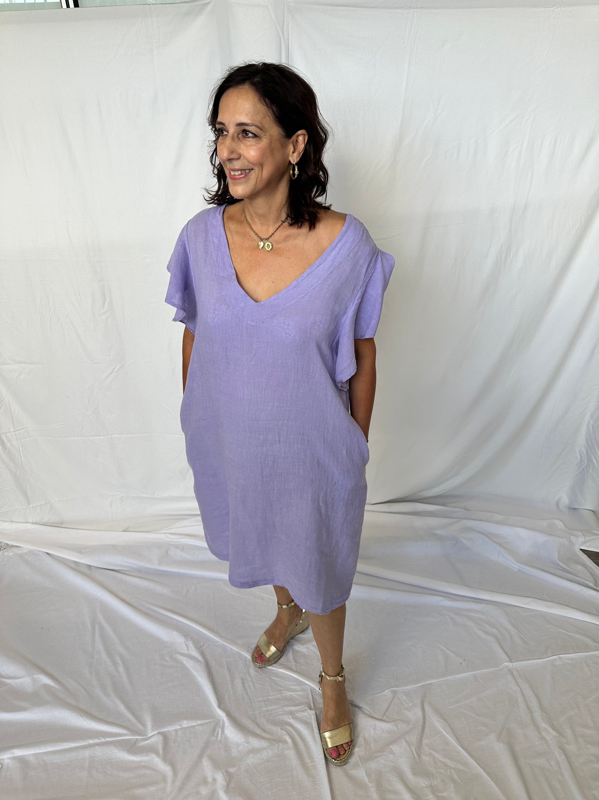 Add a dose of timeless elegance and femininity to your wardrobe with the Frill Sleeve Dress Linen in Fuschia. This dress features delicate frill sleeves, a flattering V-neck, and a convenient knee length with sleek pockets. A perfect choice for any occasion, this dress is a must-have for any stylish and sophisticated individual.