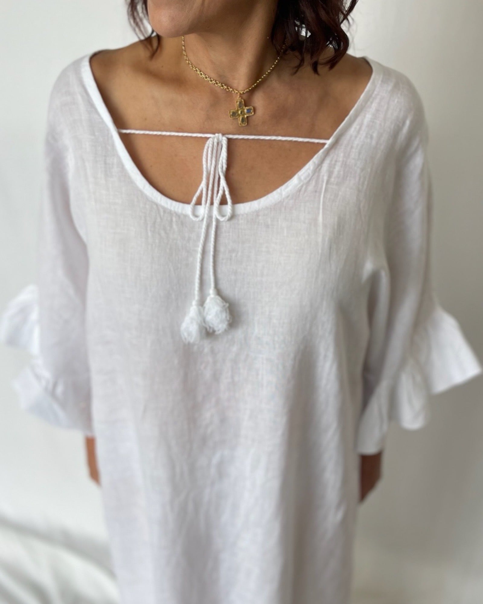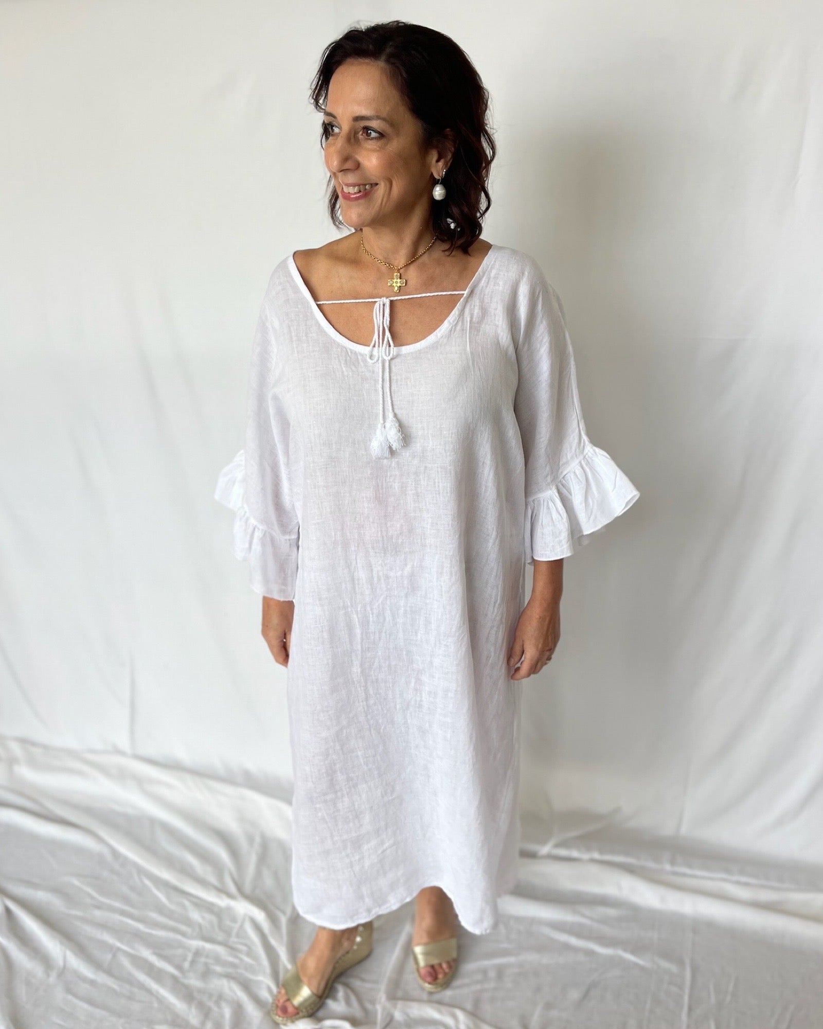 Indulge in luxury with our Linen Frill Dress. Feel sublimely comfortable in this flattering dress that suits all body shapes. The elegant sleeve with a delicate frill, paired with a tie featuring tassels at the front, adds the perfect feminine touch. Perfect for summer travel, wear over bathers or for a glamorous night out.