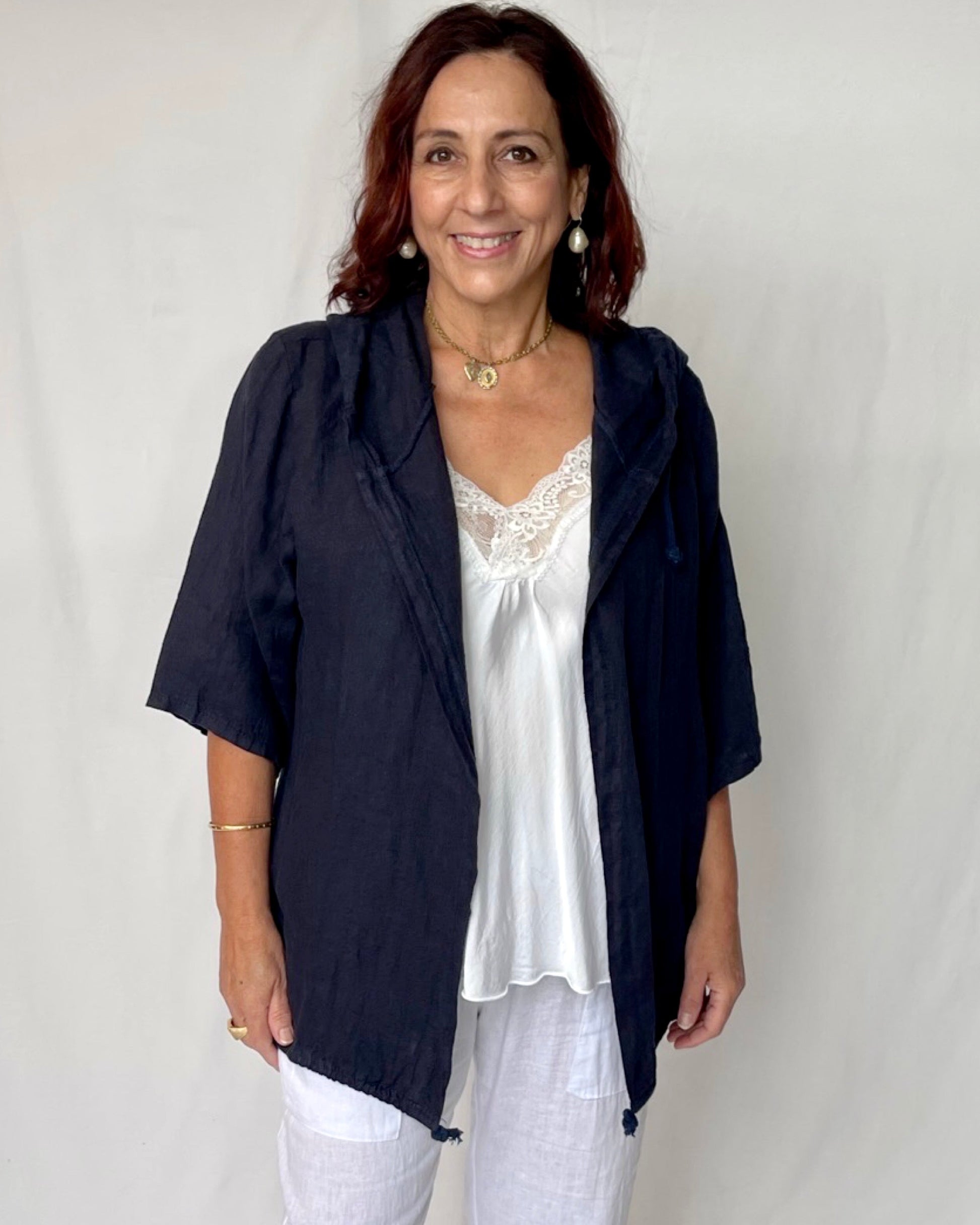 This timeless linen jacket with hood is perfect for layering over any outfit. The 3/4-length sleeves and draw string ties provide comfortable coverage on cooler summer days. Crafted with chic sophistication, this piece features a timeless hood that makes it an essential wardrobe staple for any season.