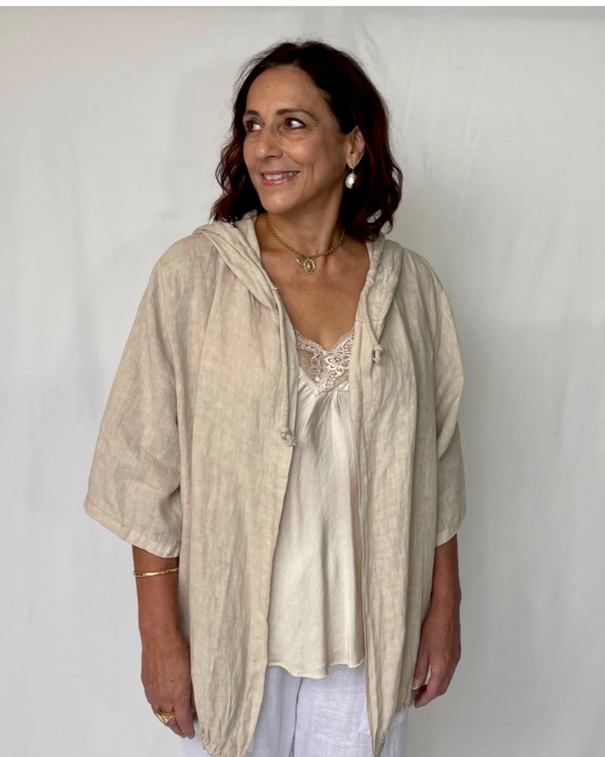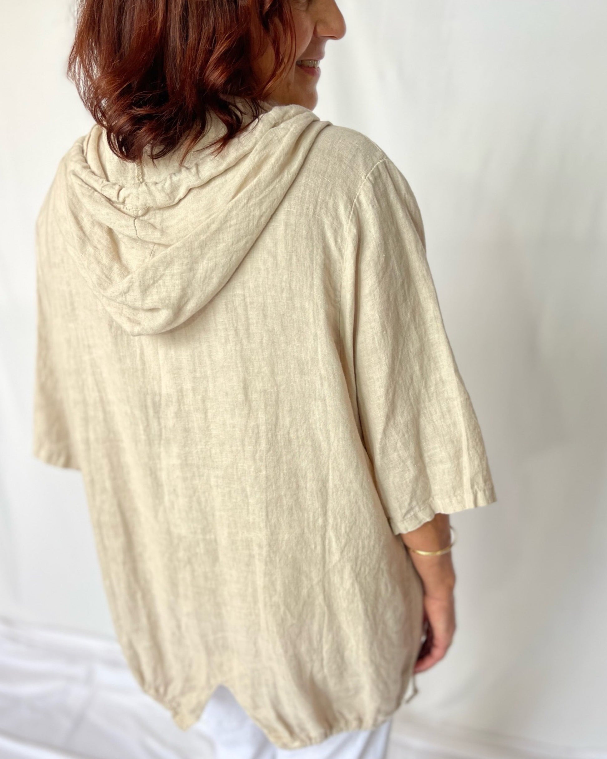 This timeless linen jacket with hood is perfect for layering over any outfit. The 3/4-length sleeves and draw string ties provide comfortable coverage on cooler summer days. Crafted with chic sophistication, this piece features a timeless hood that makes it an essential wardrobe staple for any season.