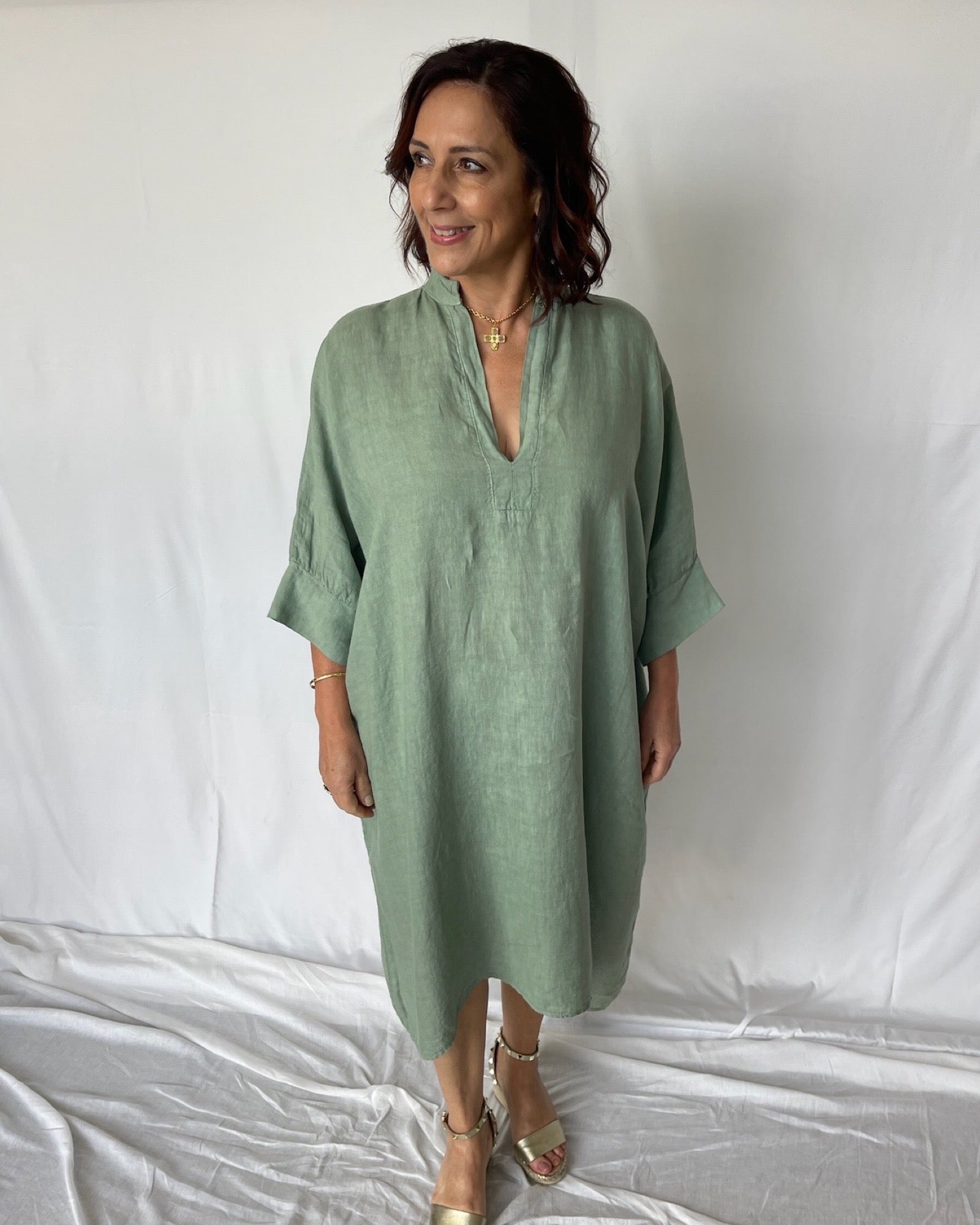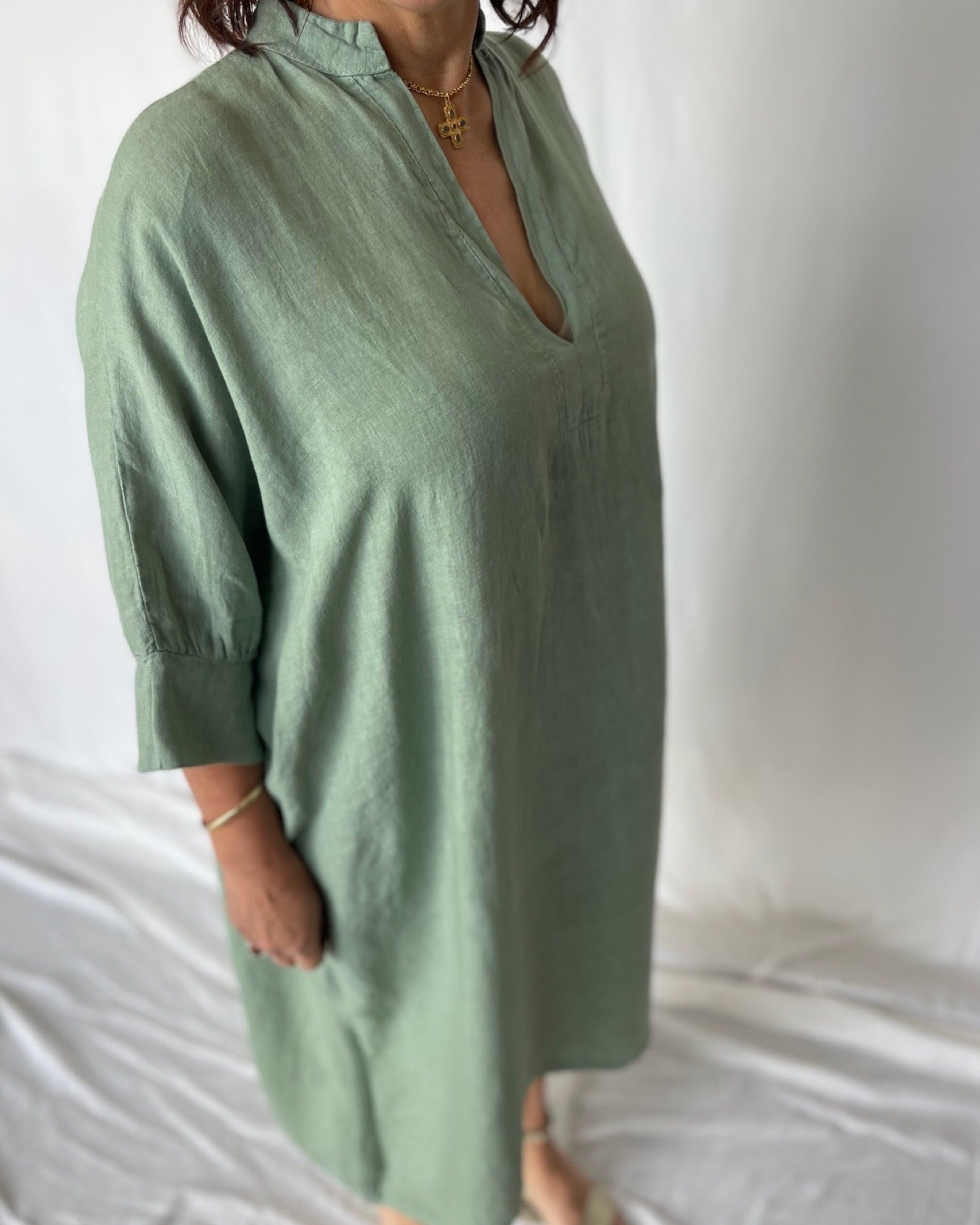 Indulge in luxury with our Linen Kaftan in a cool Sage color. This elegant piece features a grandpa collar and 3/4 sleeves, creating a sophisticated and exclusive look. Made from high-quality linen, it's perfect for any occasion. Elevate your style with this luxurious and versatile piece.