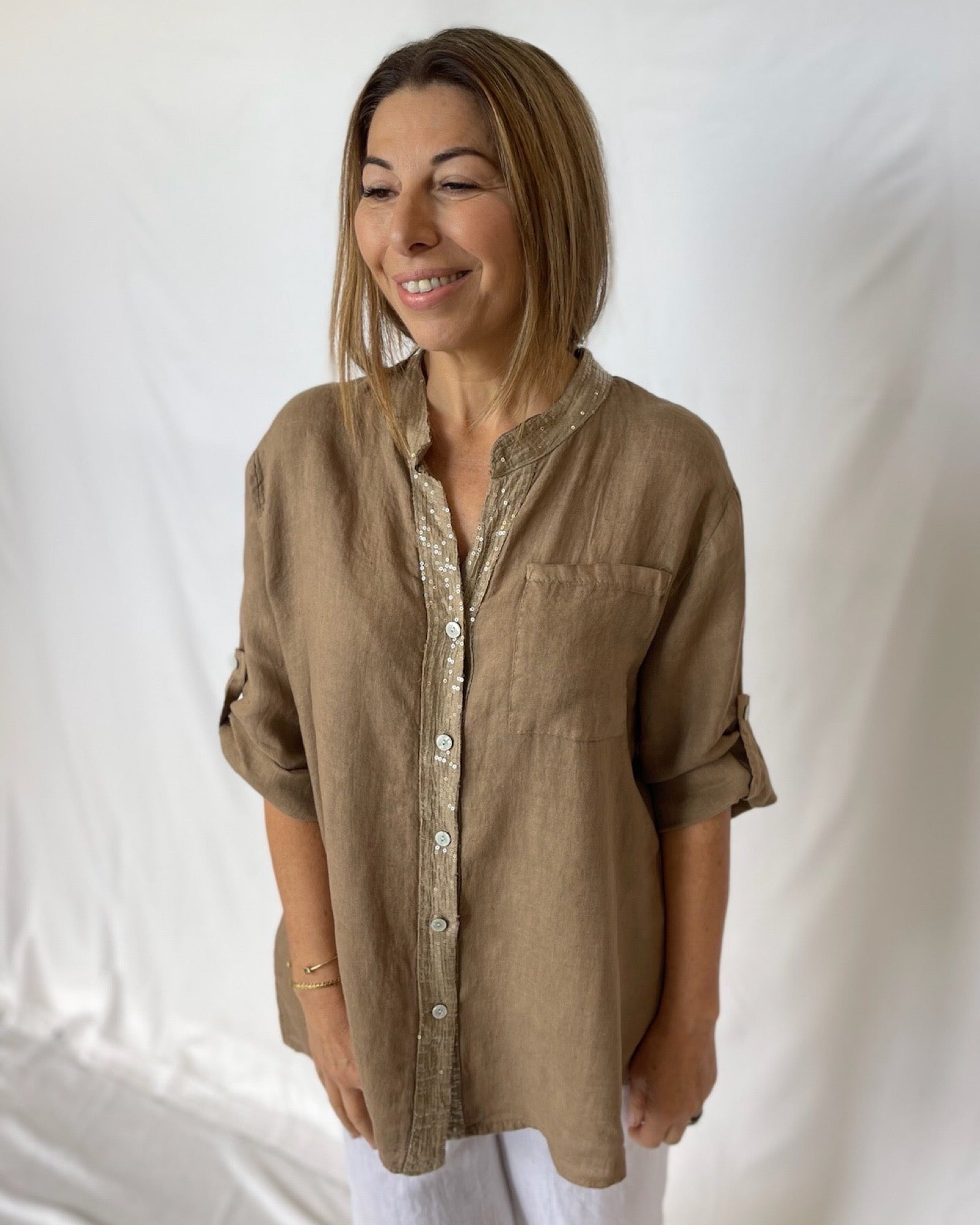This Sequin Shirt is designed for effortless elegance. Crafted from linen in classic colours, the grandpa collar accentuates the chic button down design, embellished with glossy sequins. The 3/4 sleeve can be rolled up and buttoned to create a sophisticated, versatile look; this exquisite top can even be worn as a jacket. Exude luxury and timeless style in this exquisite piece.