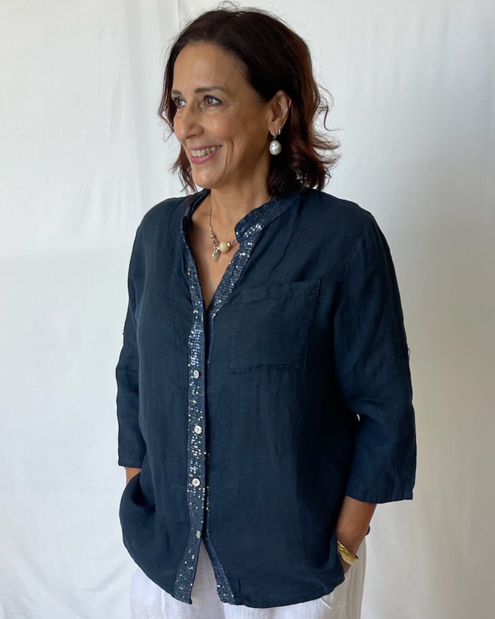 This Sequin Shirt is designed for effortless elegance. Crafted from linen in classic colours, the grandpa collar accentuates the chic button down design, embellished with glossy sequins. The 3/4 sleeve can be rolled up and buttoned to create a sophisticated, versatile look; this exquisite top can even be worn as a jacket. Exude luxury and timeless style in this exquisite piece.