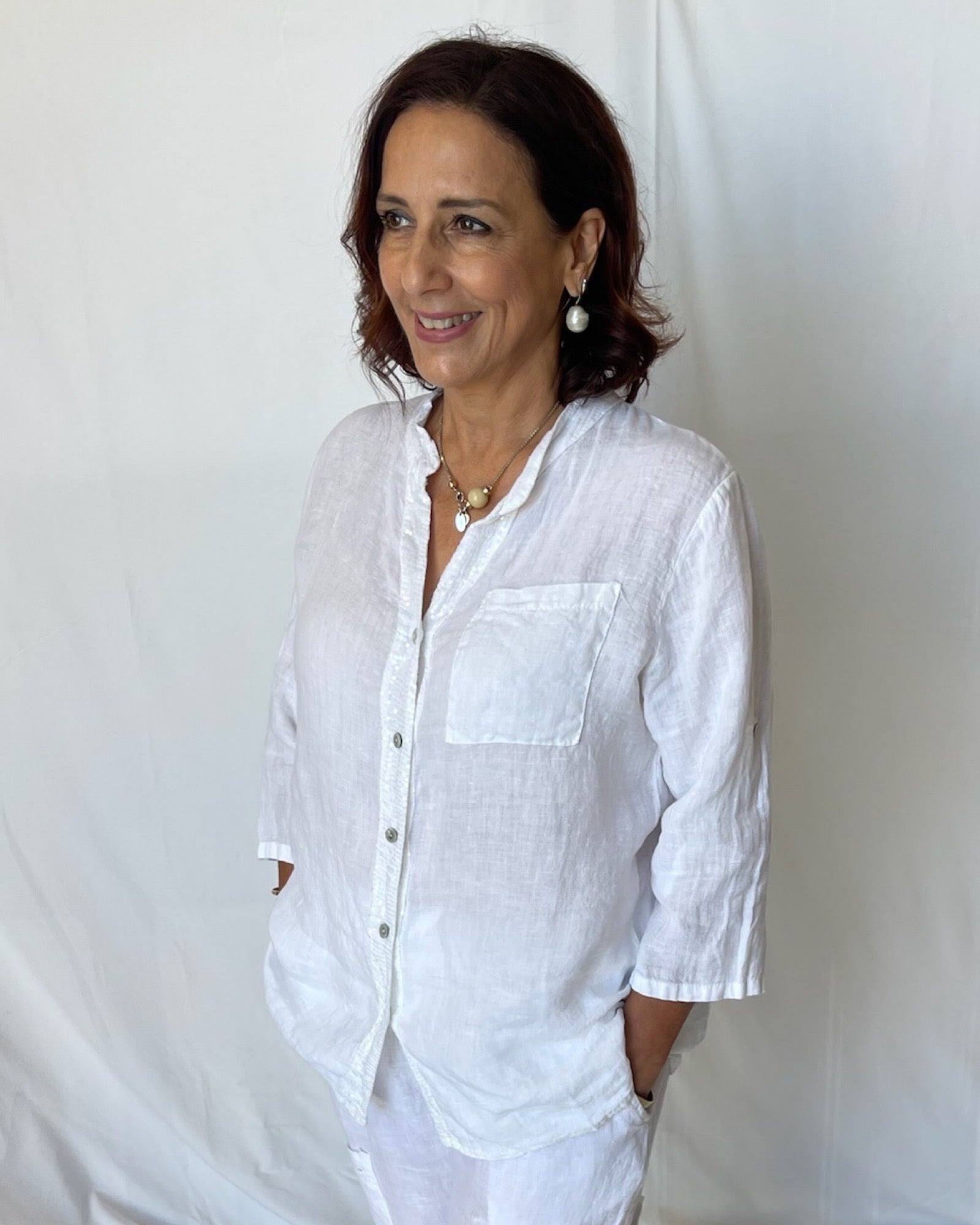 This Sequin Shirt is designed for effortless elegance. Crafted from linen in classic colours, the grandpa collar accentuates the chic button down design, embellished with glossy sequins. The 3/4 sleeve can be rolled up and buttoned to create a sophisticated, versatile look; this exquisite top can even be worn as a jacket. Exude luxury and timeless style in this exquisite piece.