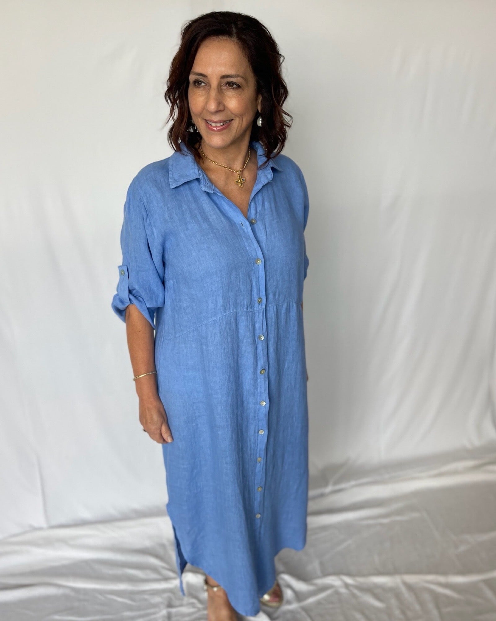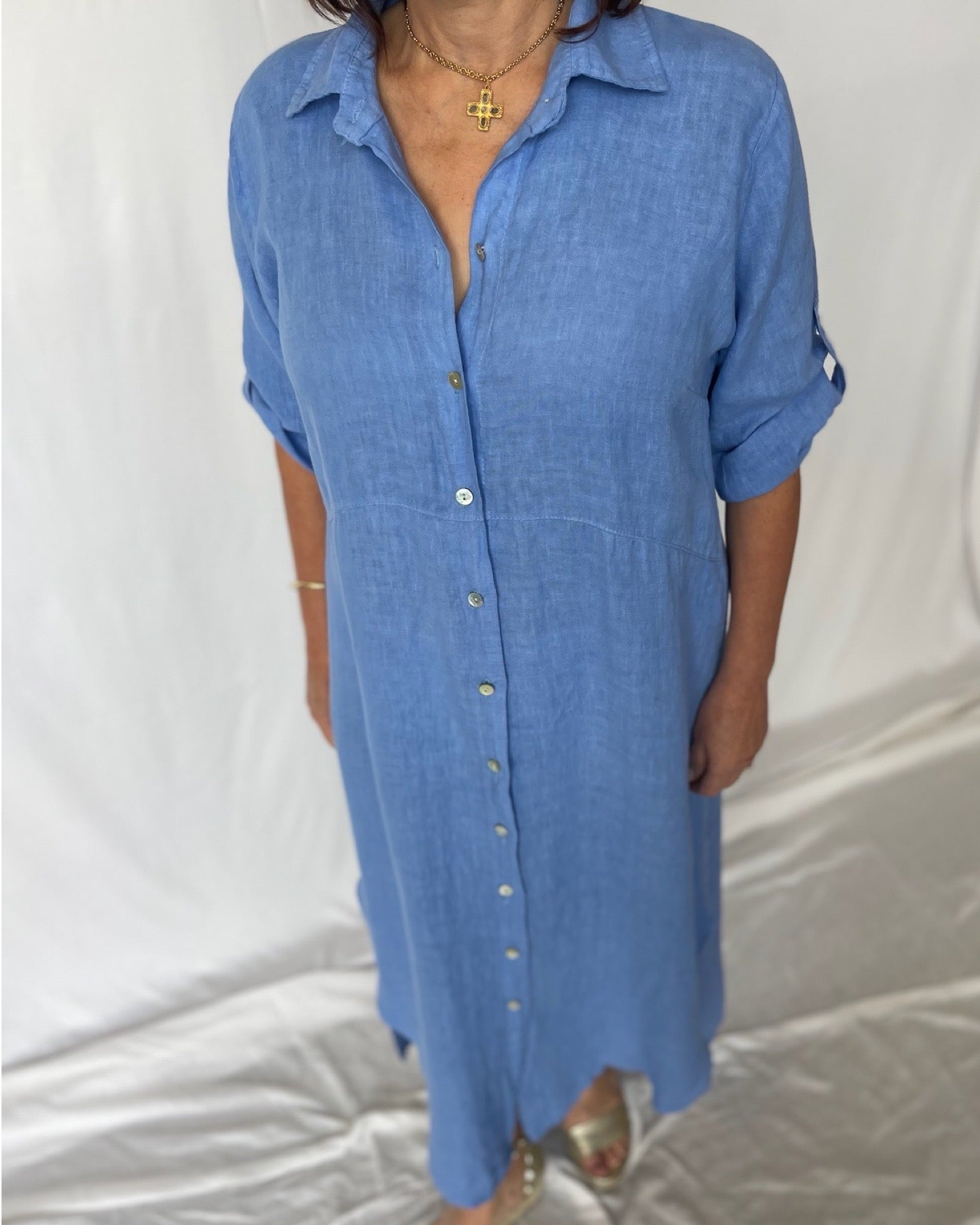 Go bold with our Linen Shirt Dress- Cornflower Blue! This relaxed and flattering silhouette will have you daringly standing out. With its timeless button down and collared neckline, you'll feel ready to take on any adventure. Be fearless and fashion-forward with this linen dress.