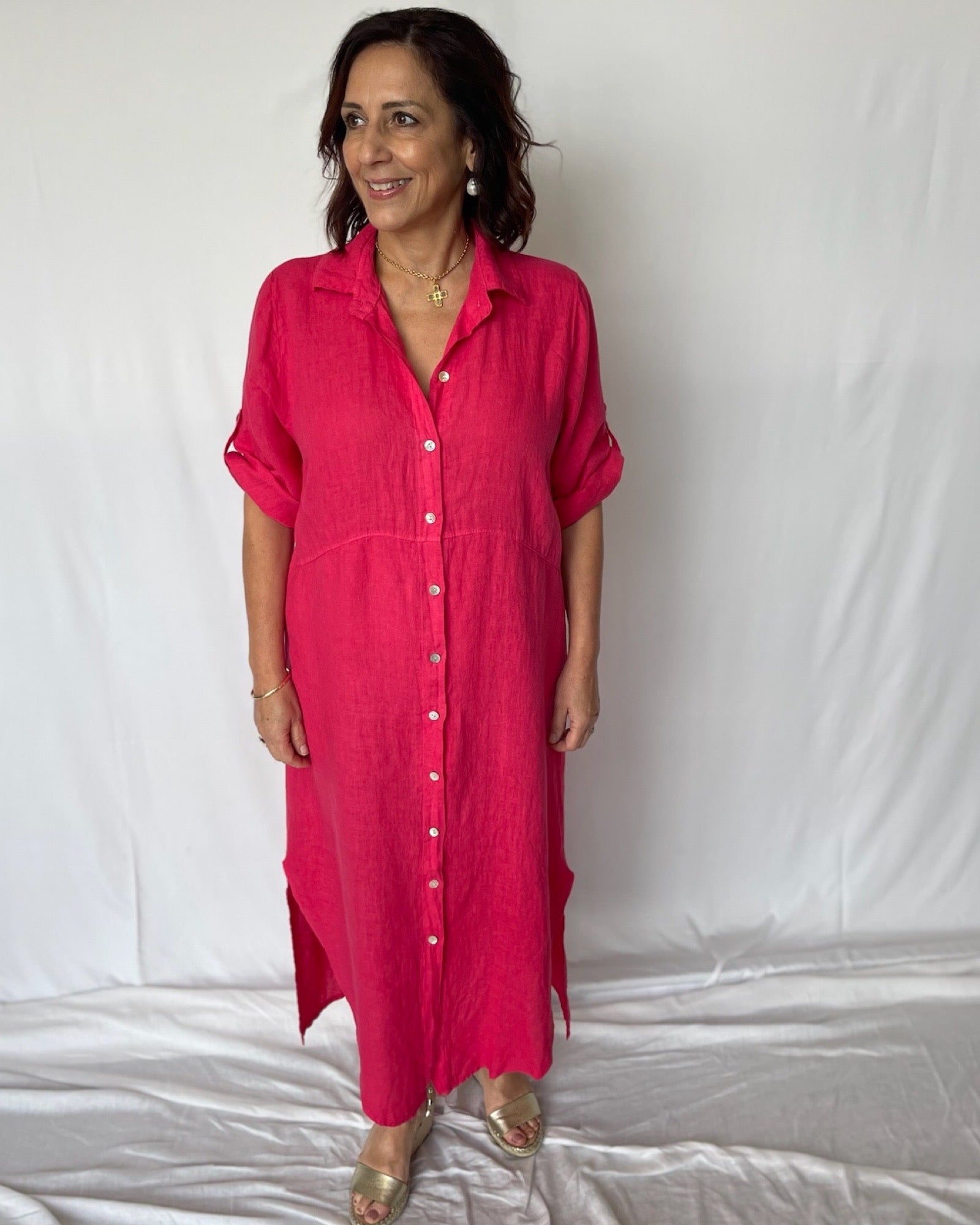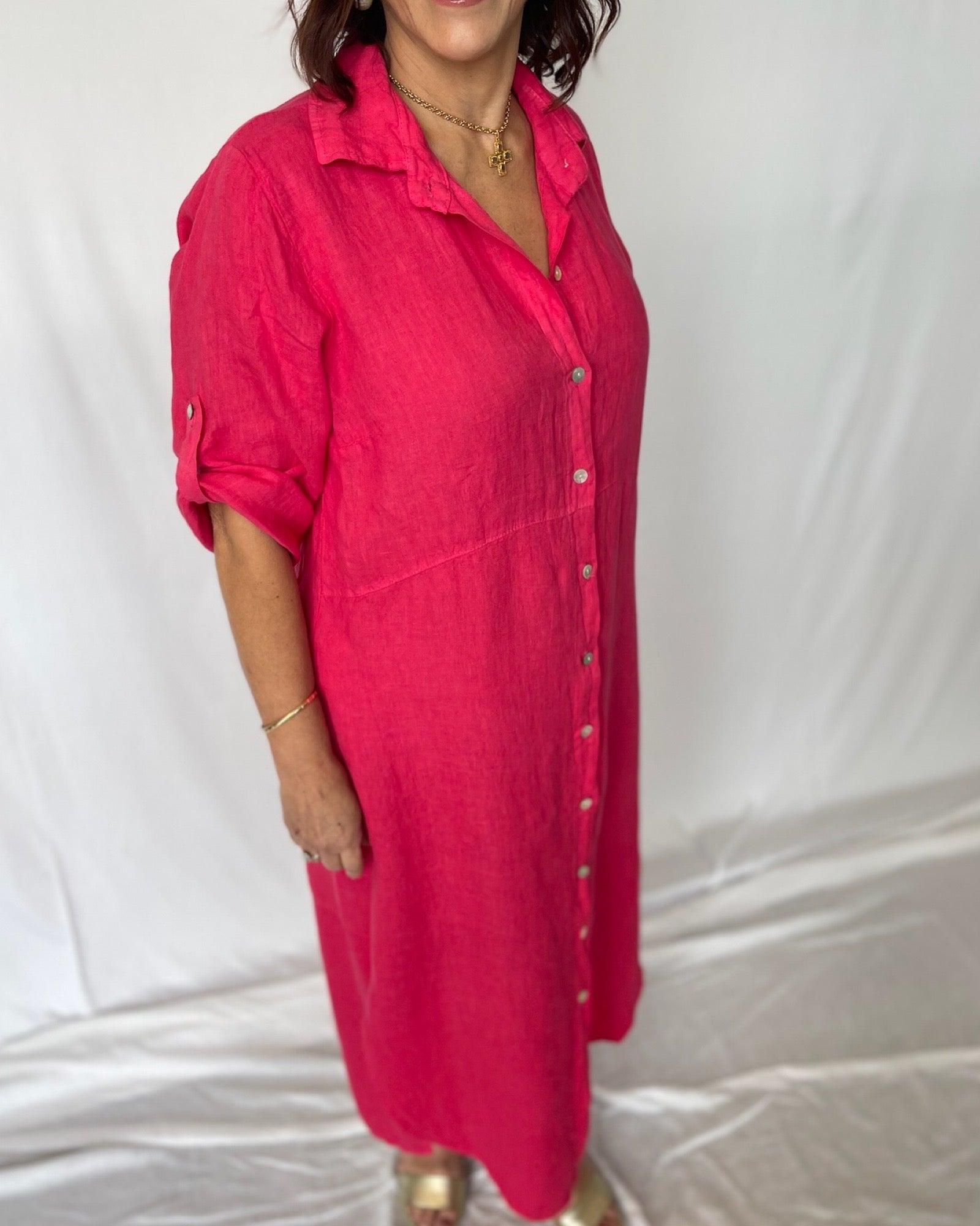 Go bold with our Linen Shirt Dress- Raspberry! This relaxed and flattering silhouette will have you daringly standing out. With its timeless button down and collared neckline, you'll feel ready to take on any adventure. Be fearless and fashion-forward with this linen dress.