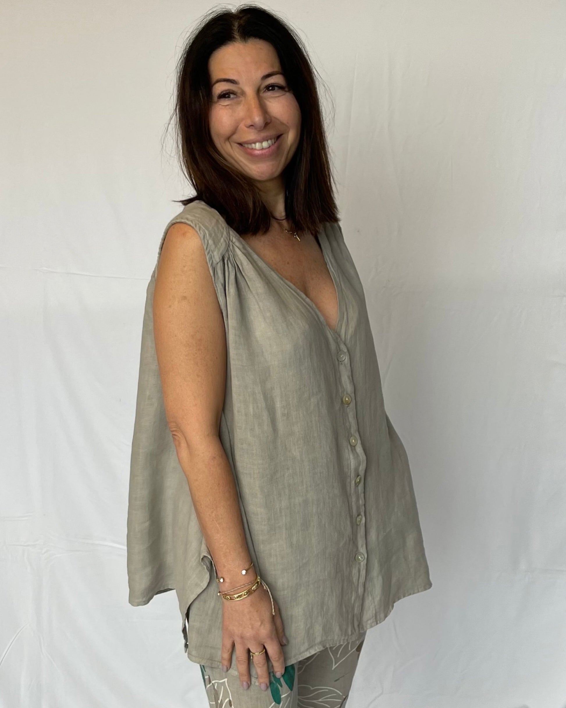 Experience a luxurious summer day with our Linen Swing Top. Featuring a sleek sleeveless button-down design, our top creates a classic, sophisticated look that moves with you. The subtle swing line provides a light airy feeling, perfect for hot summer days. Complete your look with our Floral Linen Pant for a sophisticated ensemble that's sure to turn heads.