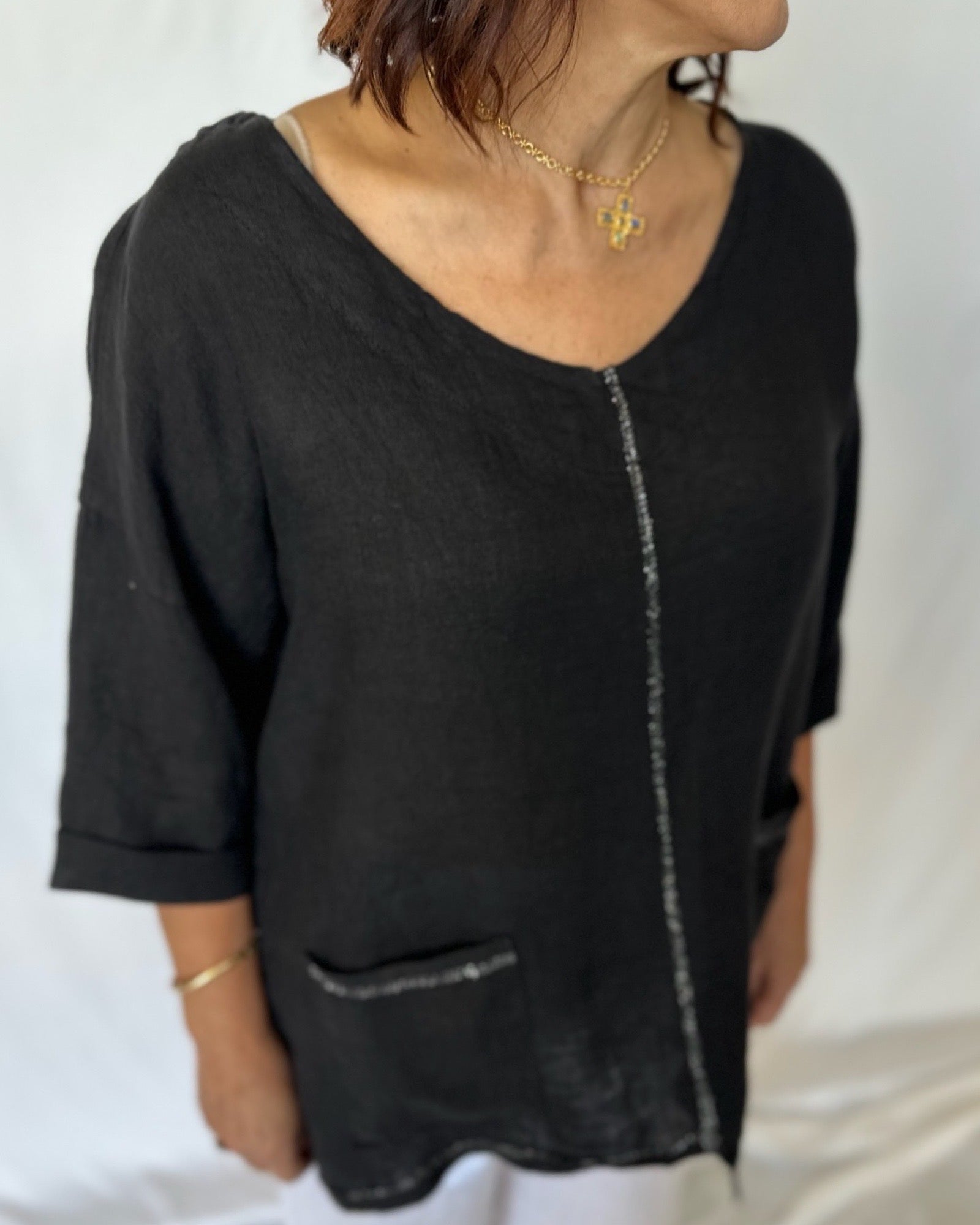 Indulge yourself in effortless elegance with our Linen Top! The easy, feminine shape is adorned with a silver thread trim on pockets and front, adding a touch of sparkling style. Complete with two front pockets and 3/4 sleeves, this top is both fashionable and functional. Elevate your wardrobe with this luxurious piece.