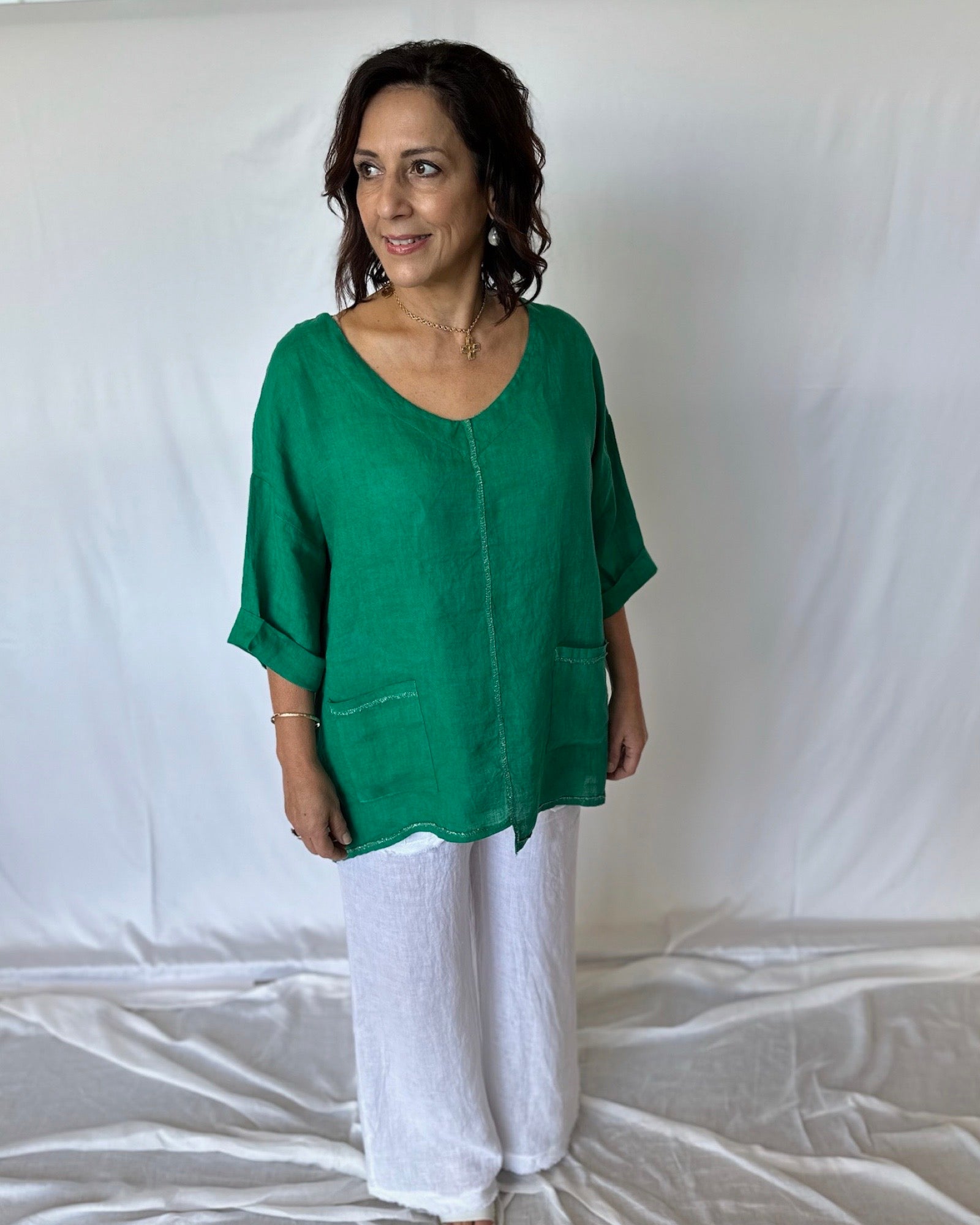 Indulge yourself in effortless elegance with our Linen Top! The easy, feminine shape is adorned with a silver thread trim on pockets and front, adding a touch of sparkling style. Complete with two front pockets and 3/4 sleeves, this top is both fashionable and functional. Elevate your wardrobe with this luxurious piece.