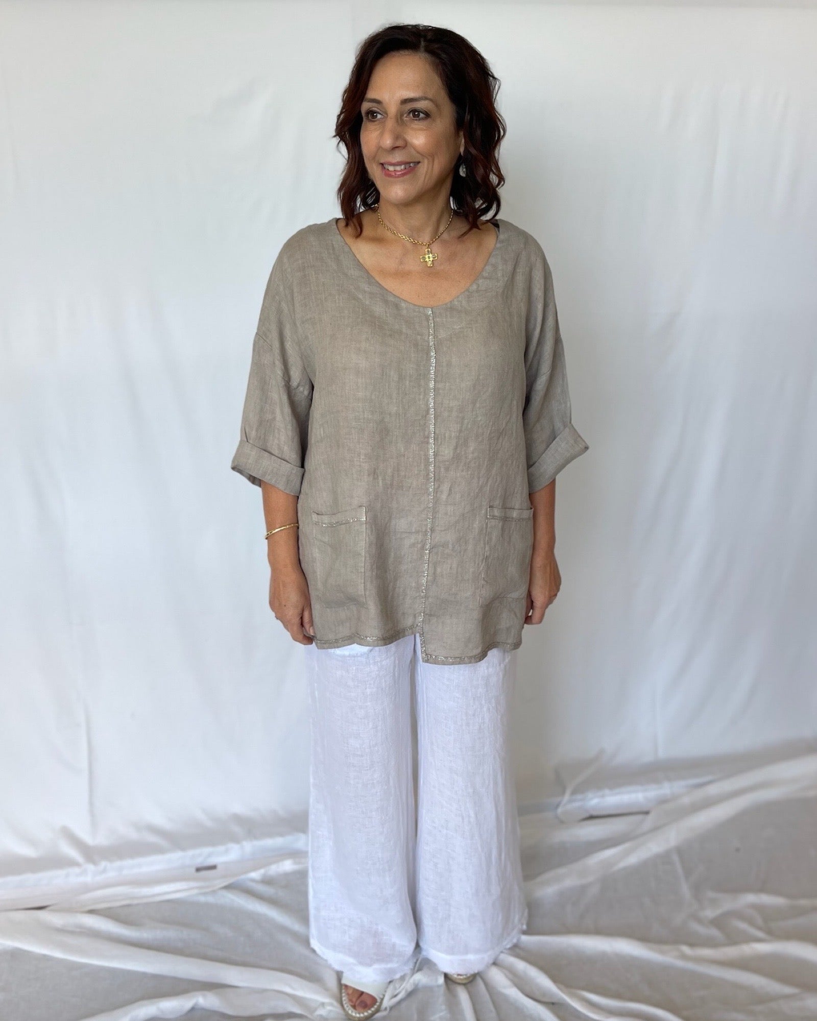 Indulge yourself in effortless elegance with our Linen Top! The easy, feminine shape is adorned with a silver thread trim on pockets and front, adding a touch of sparkling style. Complete with two front pockets and 3/4 sleeves, this top is both fashionable and functional. Elevate your wardrobe with this luxurious piece.
