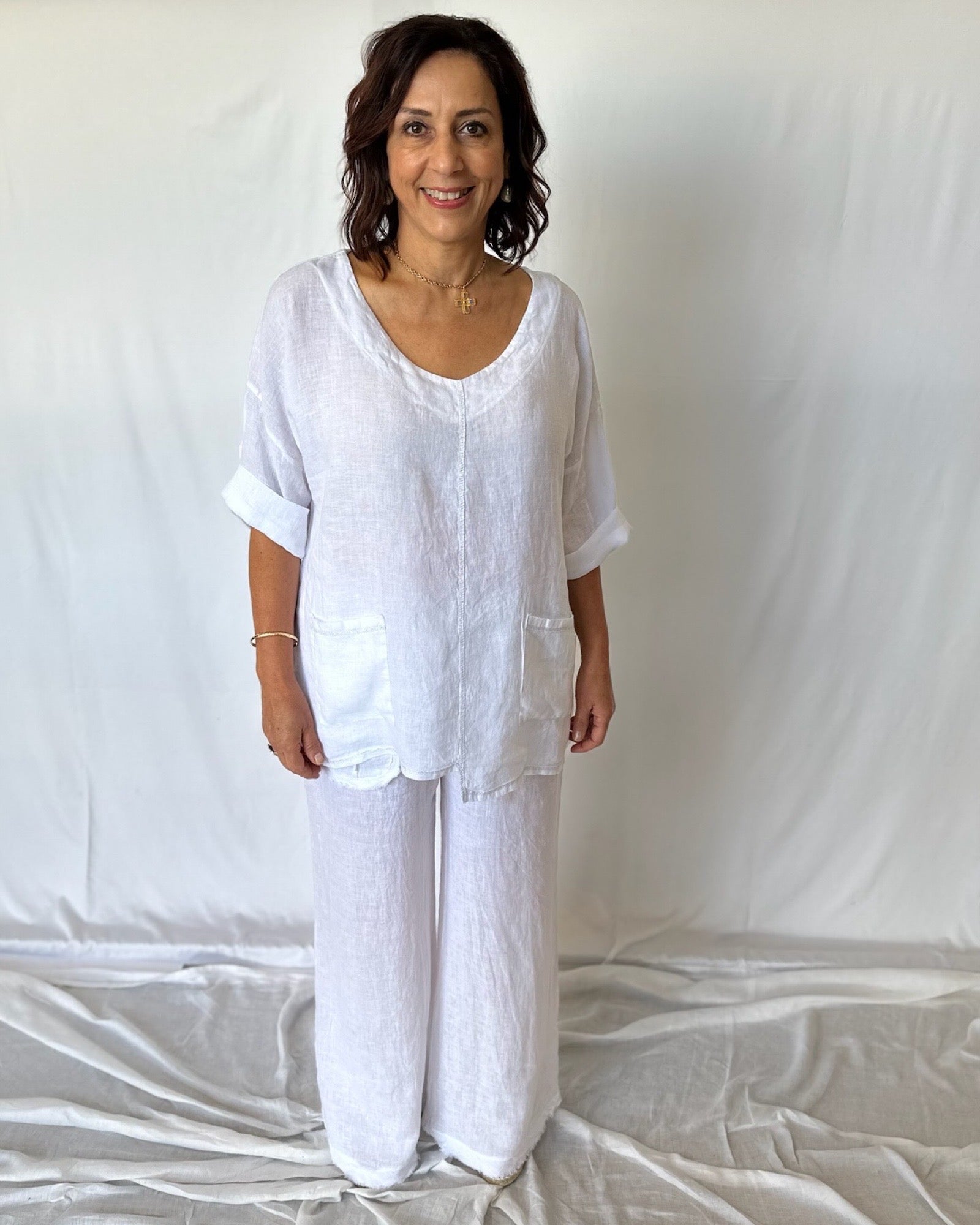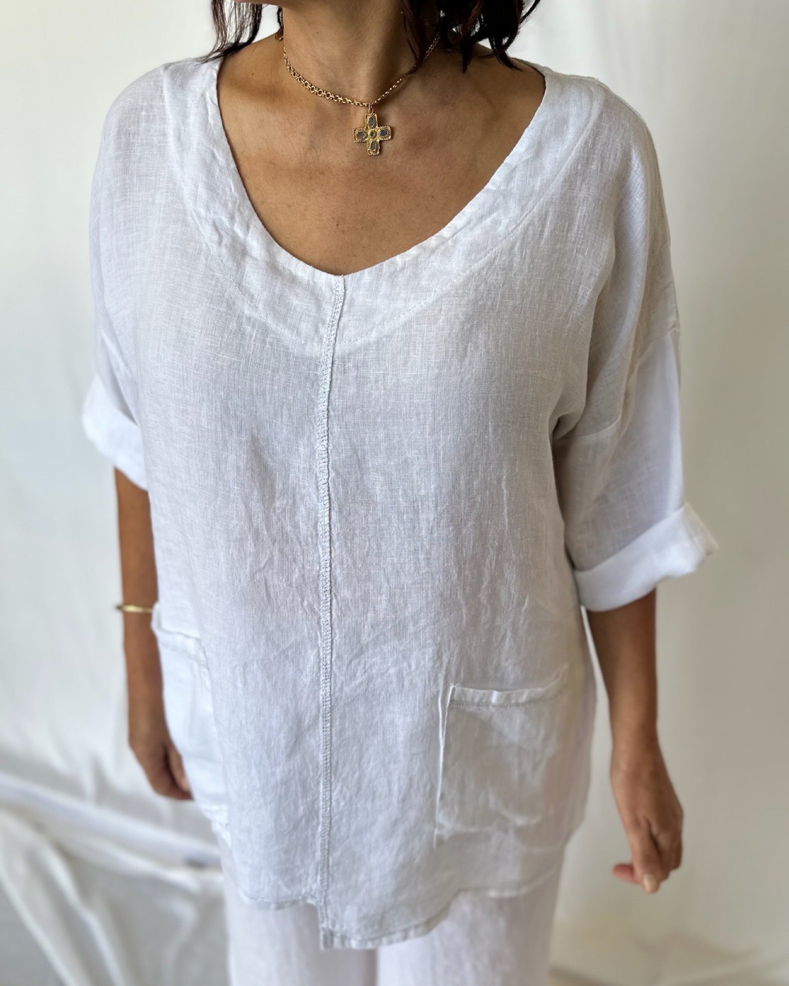 Indulge yourself in effortless elegance with our Linen Top! The easy, feminine shape is adorned with a silver thread trim on pockets and front, adding a touch of sparkling style. Complete with two front pockets and 3/4 sleeves, this top is both fashionable and functional. Elevate your wardrobe with this luxurious piece.