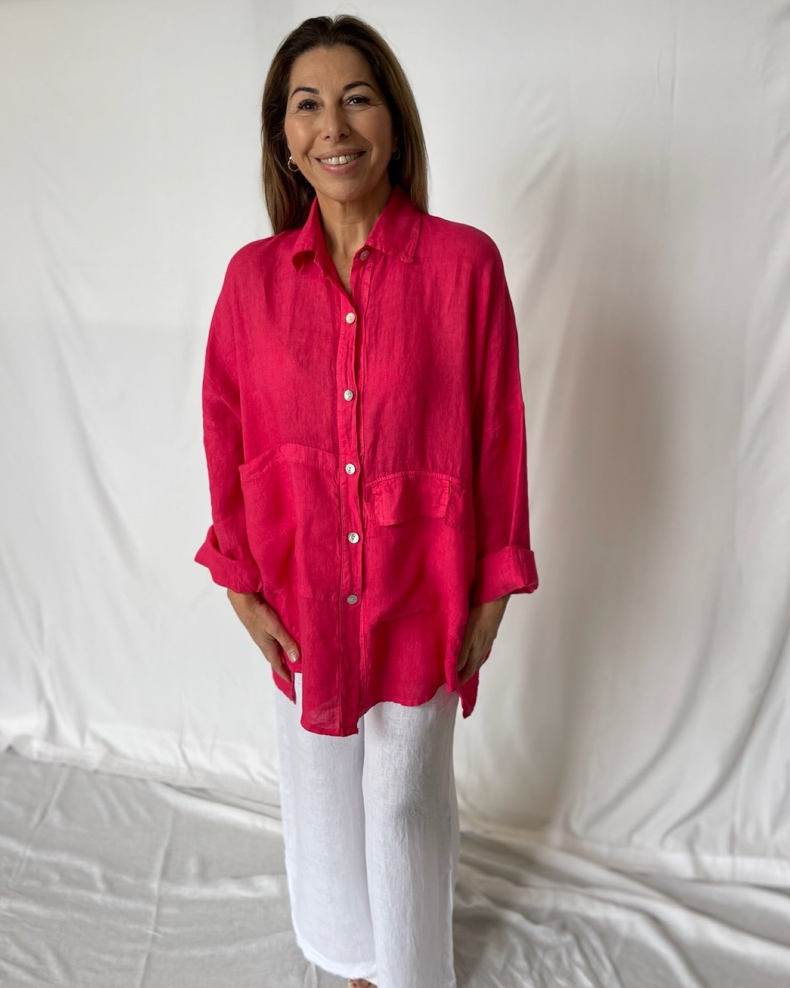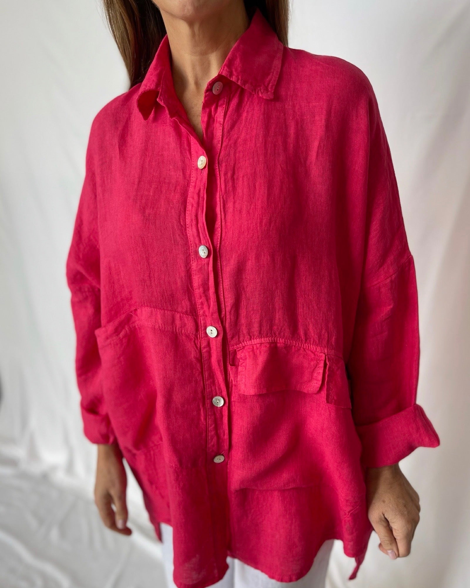 Take on the day with our bold and oversized Pocket Shirt in Raspberry. This classic shirt can be worn open for a daring and chic look. Embrace your adventurous side and make a statement with this versatile piece!