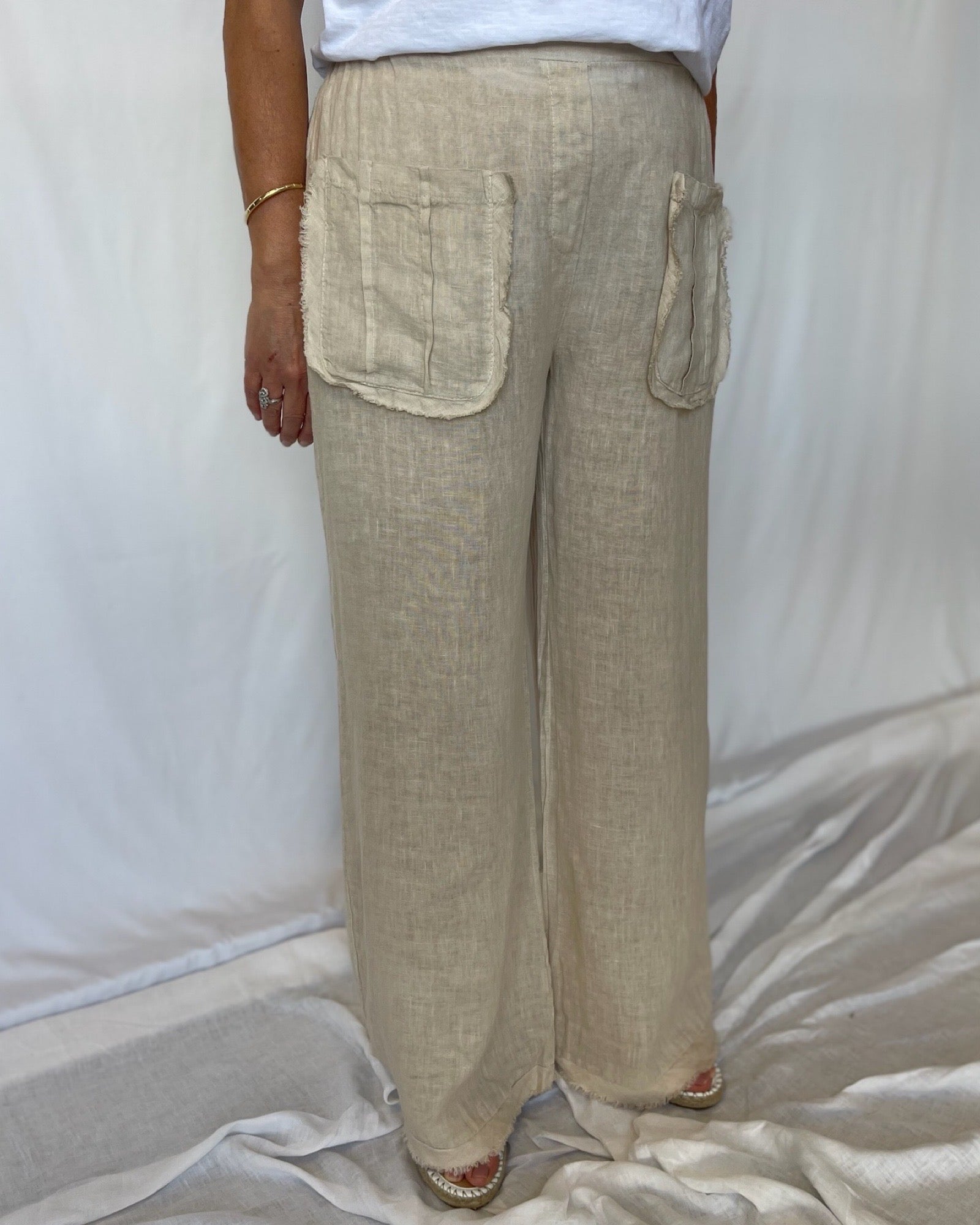 Effortlessly chic, the Raw Pocket Pant Linen in White features a comfortable silhouette and a slightly wide leg, perfect for any occasion. The elasticated back waist ensures a perfect fit, while the raw edged finish adds a touch of class. A must-have for your wardrobe this summer!!