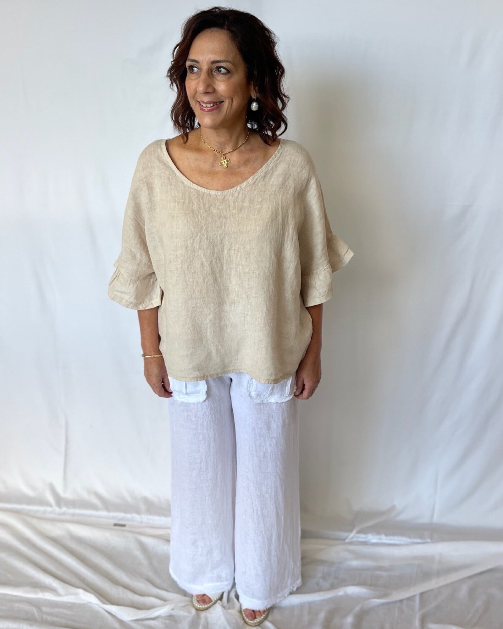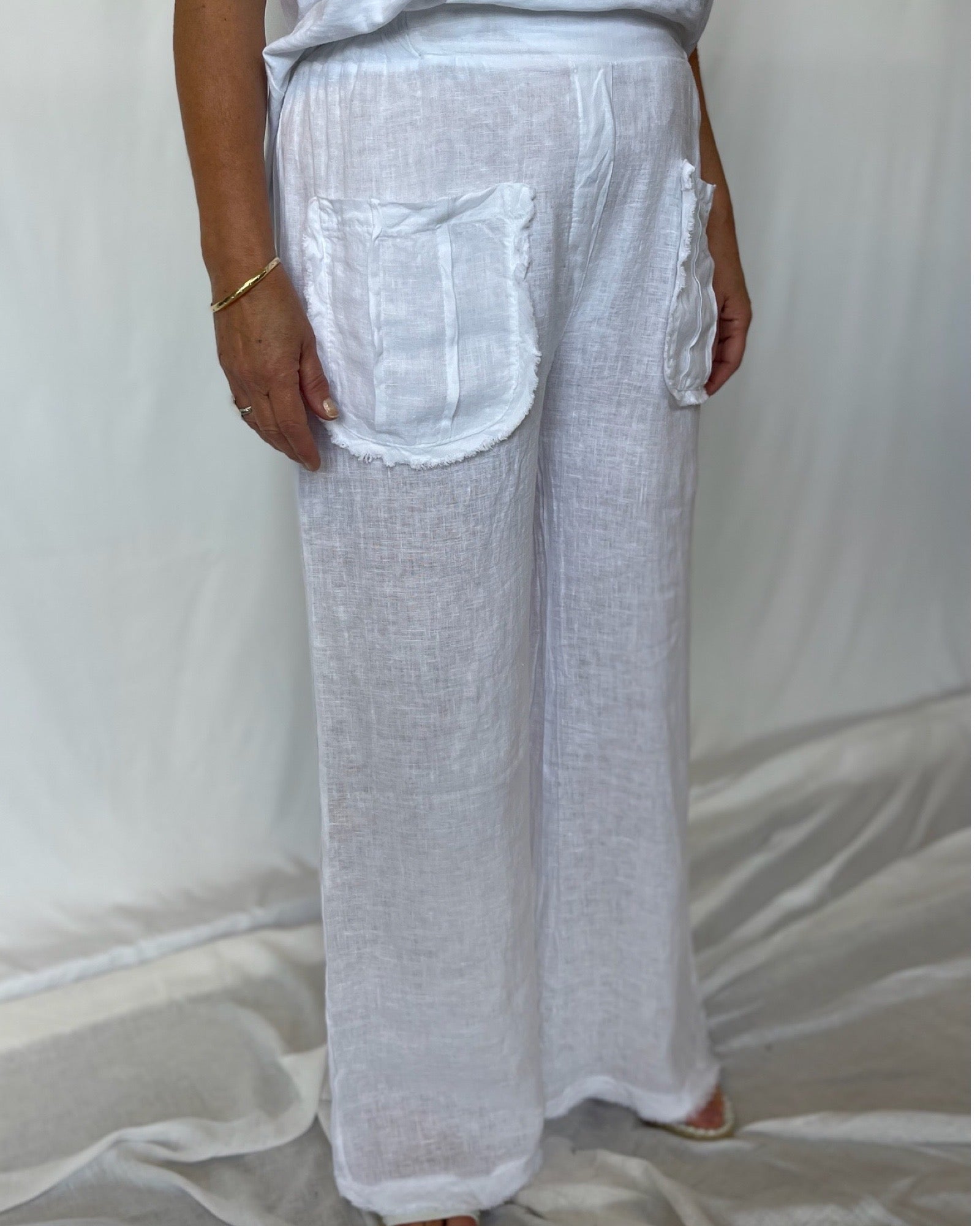 Effortlessly chic, the Raw Pocket Pant Linen in White features a comfortable silhouette and a slightly wide leg, perfect for any occasion. The elasticated back waist ensures a perfect fit, while the raw edged finish adds a touch of class. A must-have for your wardrobe this summer!!