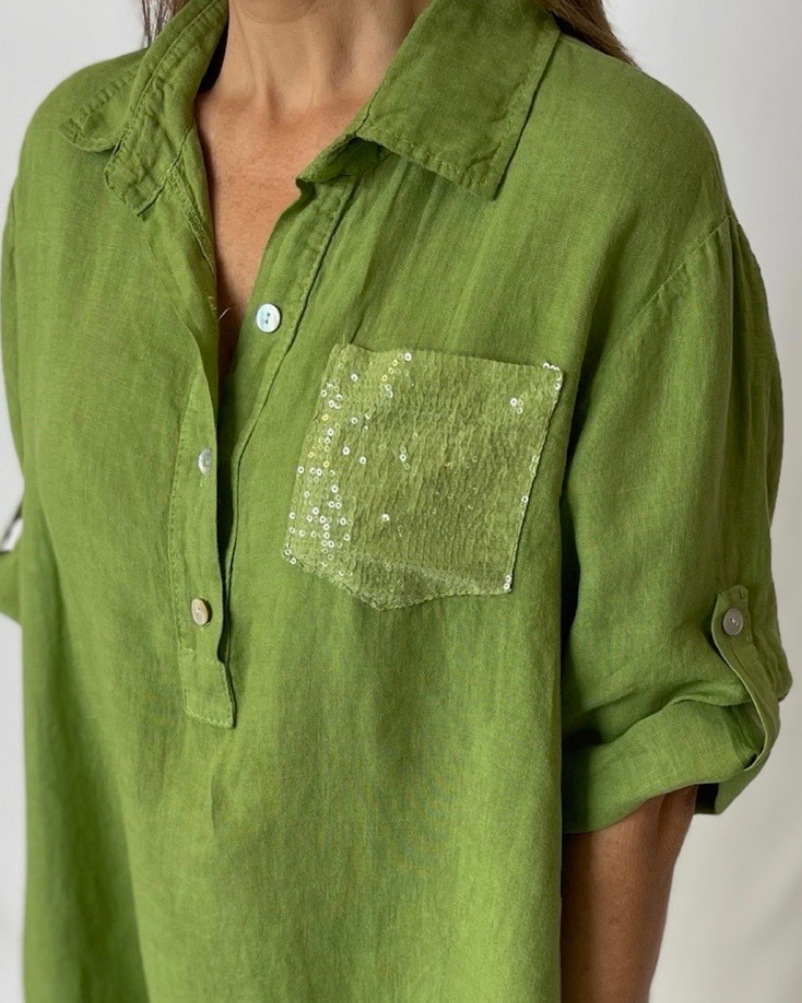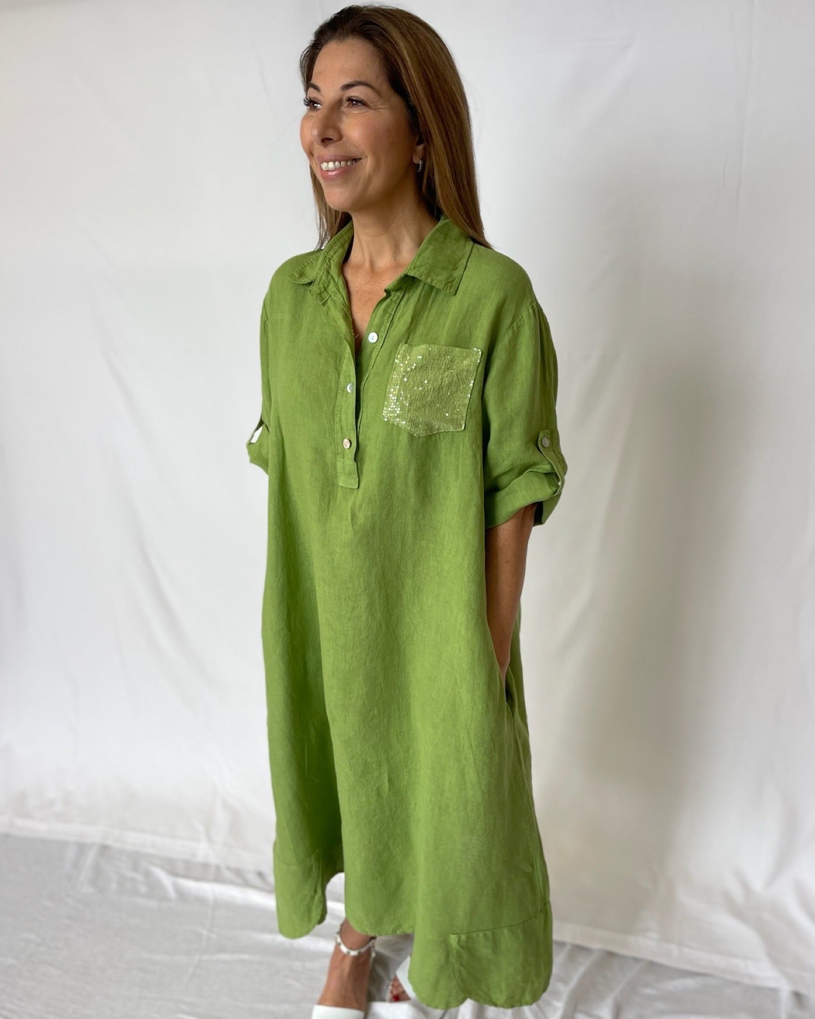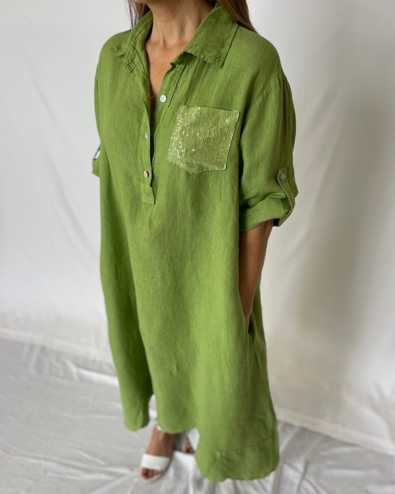 The Sequin Dress Linen boasts a distinctive design with sequin embellished pockets, a sophisticated collar, and roll-up sleeves with a tab for a conservative and fun appeal. Add a touch of luxury to your wardrobe with this exclusive dress. Perfect for any occasion, it's both elegant and playful.