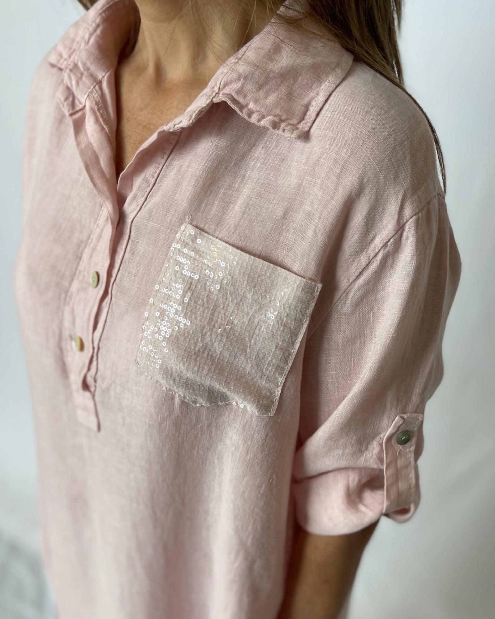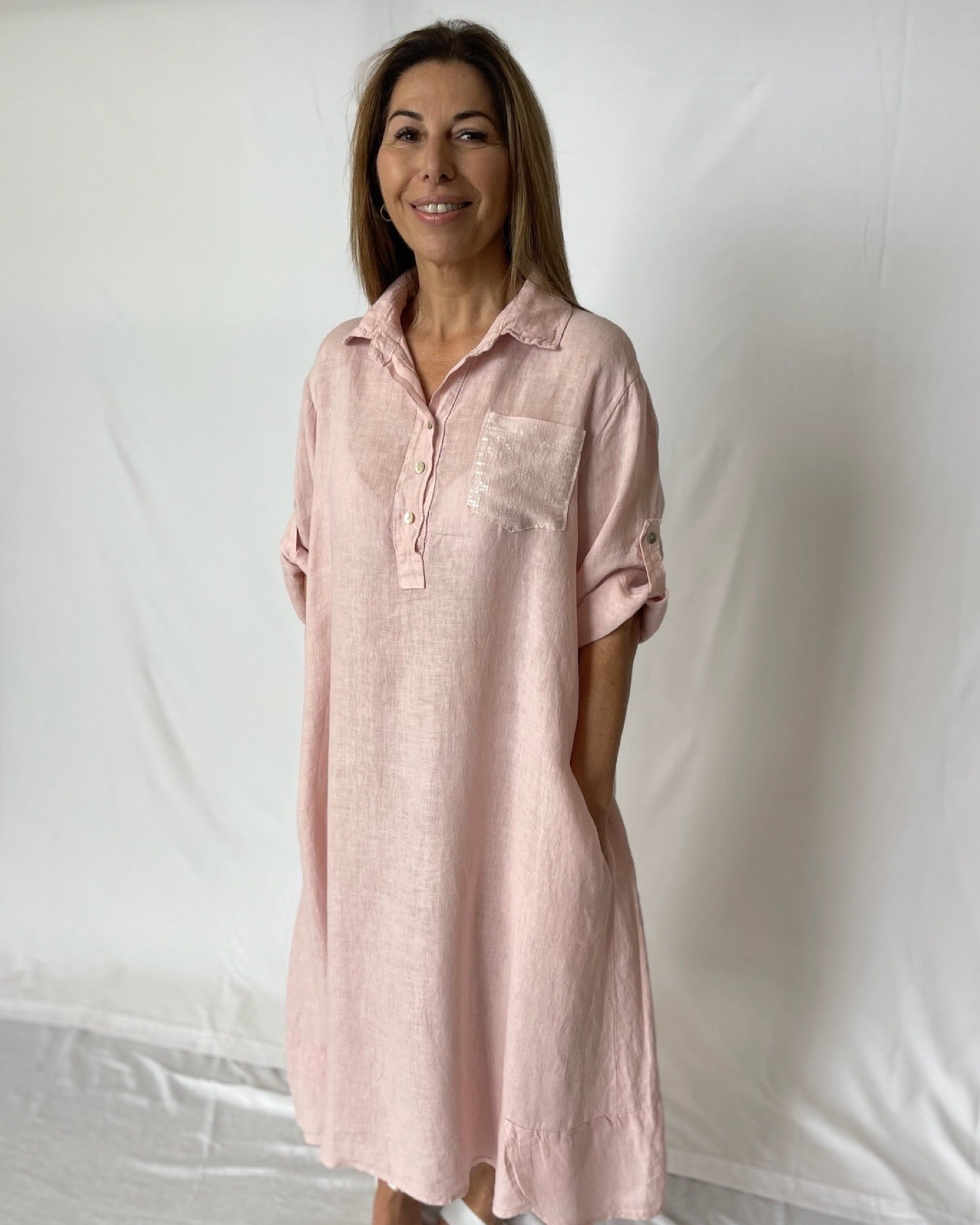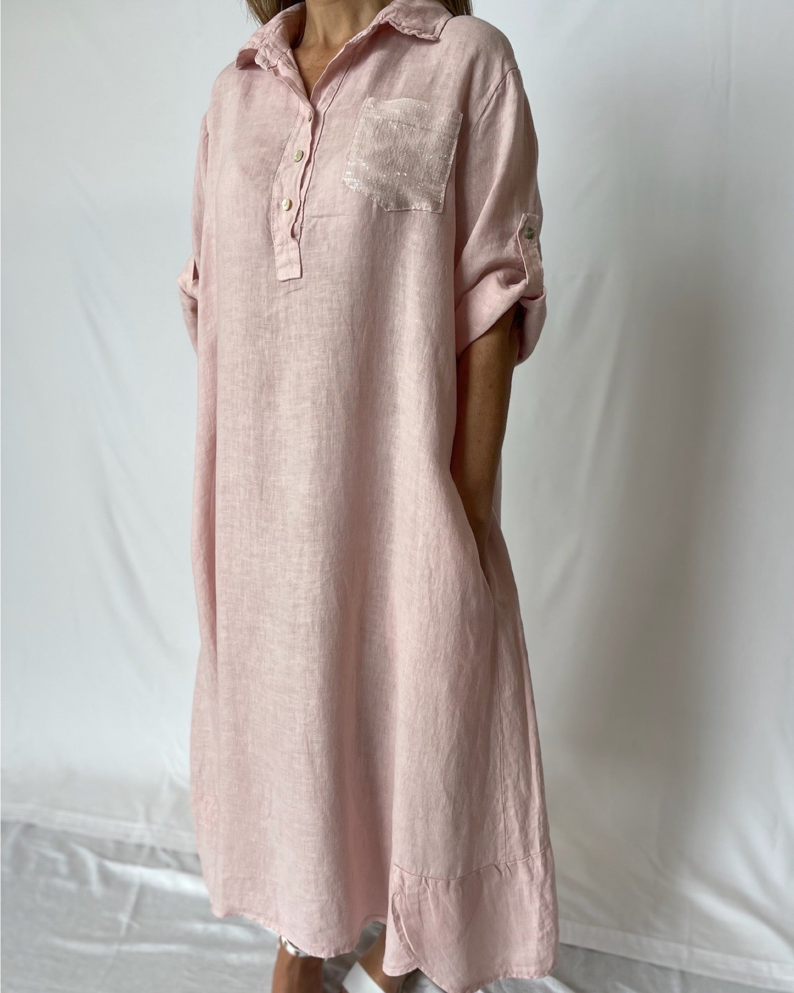 The Sequin Dress Linen boasts a distinctive design with sequin embellished pockets, a sophisticated collar, and roll-up sleeves with a tab for a conservative and fun appeal. Add a touch of luxury to your wardrobe with this exclusive dress. Perfect for any occasion, it's both elegant and playful.
