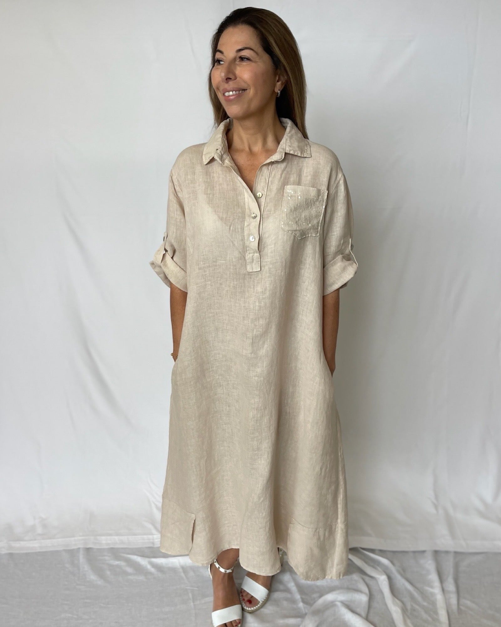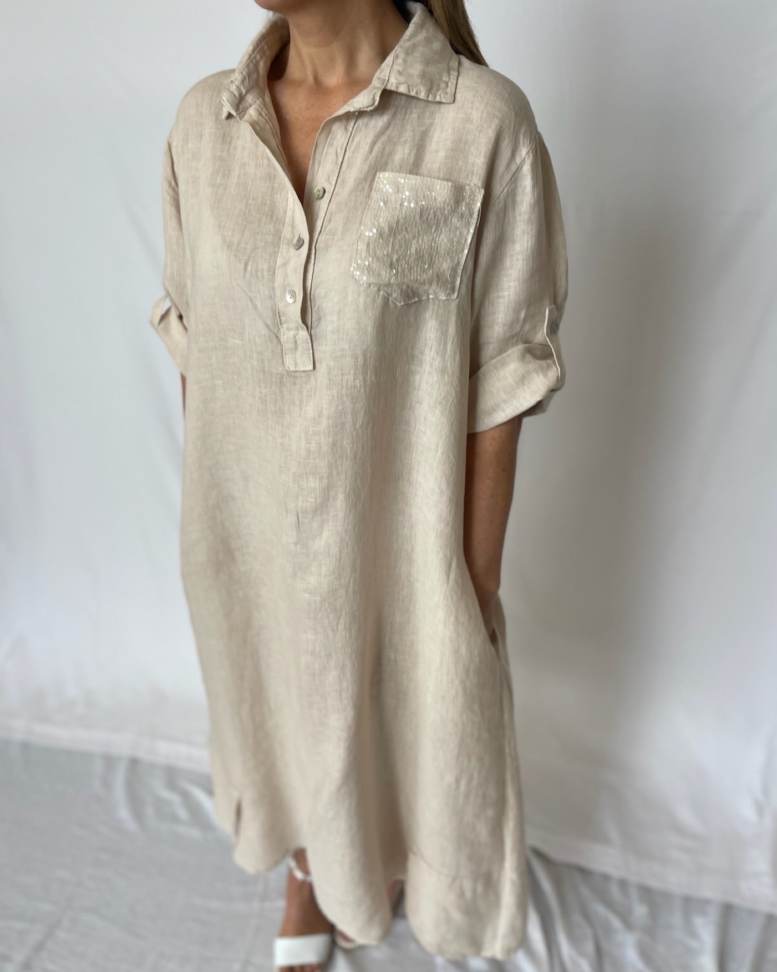 The Sequin Dress Linen boasts a distinctive design with sequin embellished pockets, a sophisticated collar, and roll-up sleeves with a tab for a conservative and fun appeal. Add a touch of luxury to your wardrobe with this exclusive dress. Perfect for any occasion, it's both elegant and playful.