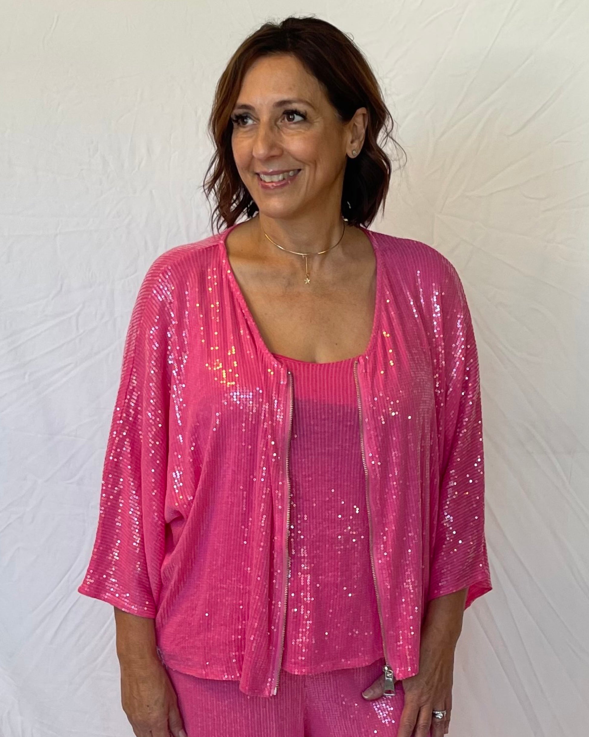 Add some sparkle to your wardrobe with this Sequin Jacket! This stylish and fun piece is perfect for adding pizzazz to any outfit ā with 7/8 sleeves and zip up front, you'll be ready to take on the world! Complete the look with the Sequin Pant for a dazzling finish. What colour will you choose? Let the party begin!