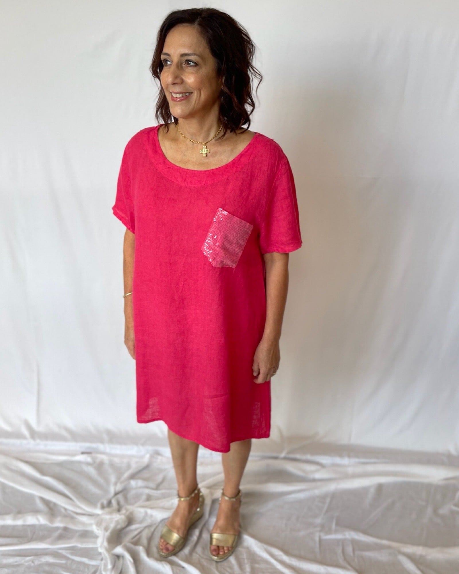 Unleash your inner fashion daredevil with our Sequin Swing Linen Dress-Navy! This sassy dress features a knee-length, a-line design with short sleeves and a unique sequin pocket. Add a splash of color to your wardrobe and stand out from the crowd with this bold and fashionable piece. Perfect for those who aren't afraid to take risks!