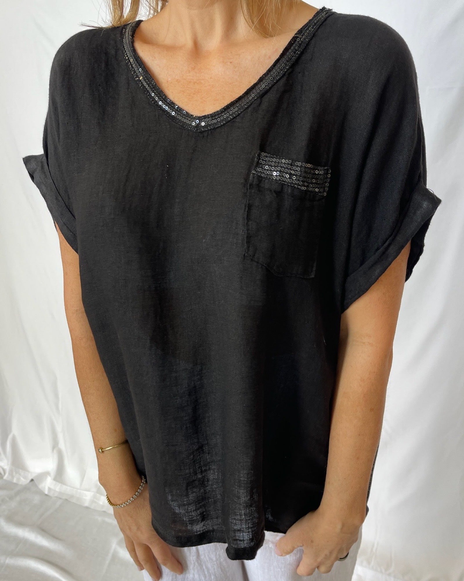 Presenting the Sequin V-Neck Linen Top: a versatile and chic must-have for your wardrobe. Made with soft linen on the front and cozy cotton jersey on the back. Complete with sequins adorning the V-neck and front pocket, this classic yet stylish top will elevate any outfit with a touch of elegance.