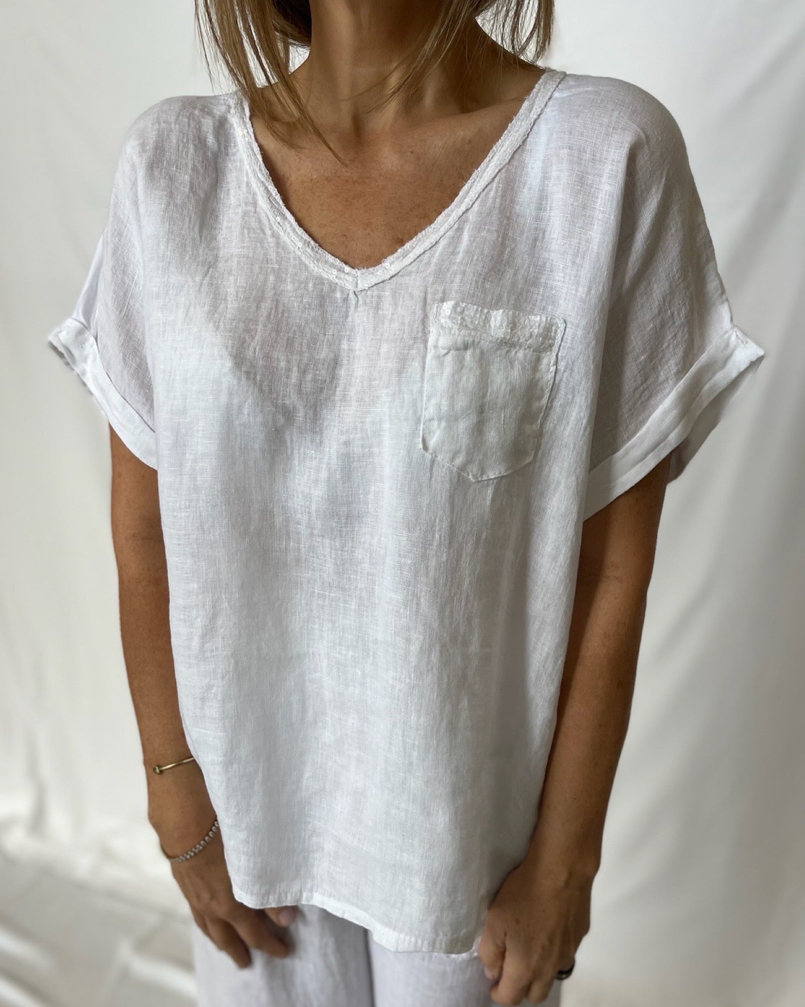 Presenting the Sequin V-Neck Linen Top: a versatile and chic must-have for your wardrobe. Made with soft linen on the front and cozy cotton jersey on the back. Complete with sequins adorning the V-neck and front pocket, this classic yet stylish top will elevate any outfit with a touch of elegance.