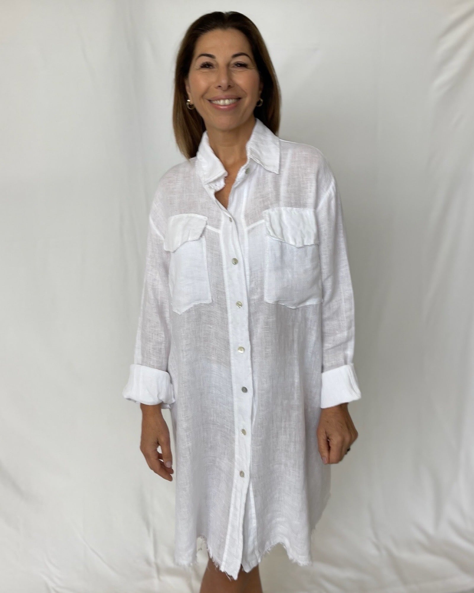 Looking for your new favorite piece? This Shirt Dress Linen in Classic White is just what you need. With a chic summer style and long sleeves embellished with silver threading, this dress can be worn almost anywhere. From the beach to a night out, it adds a refined coastal classic look to any outfit.