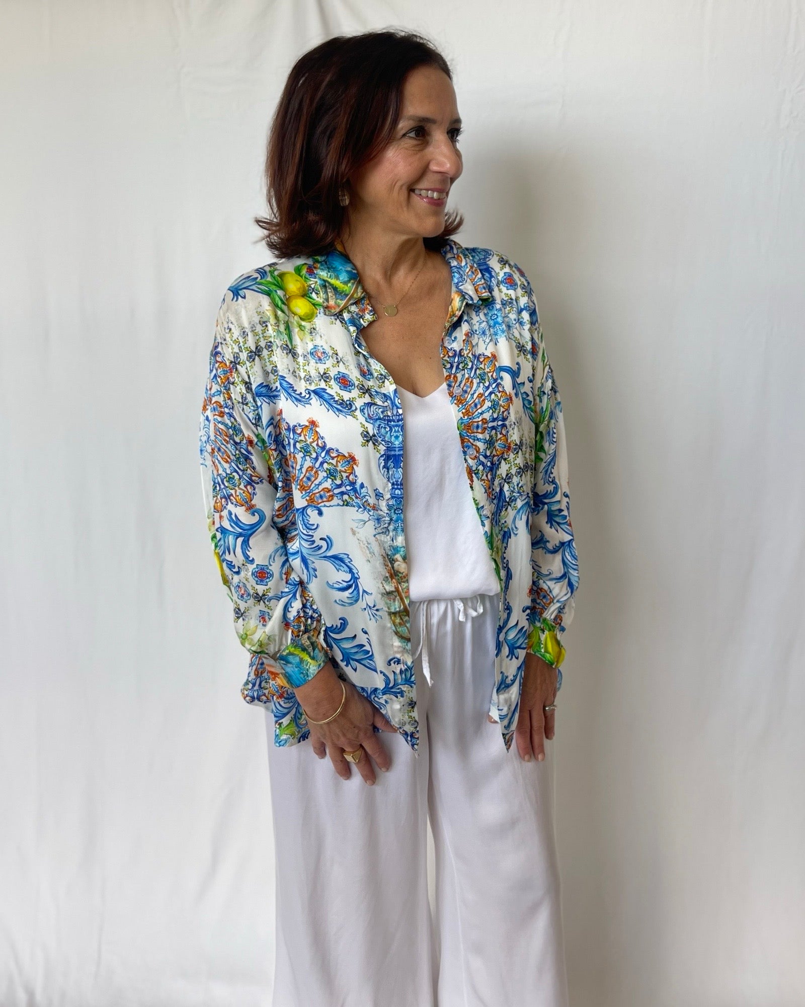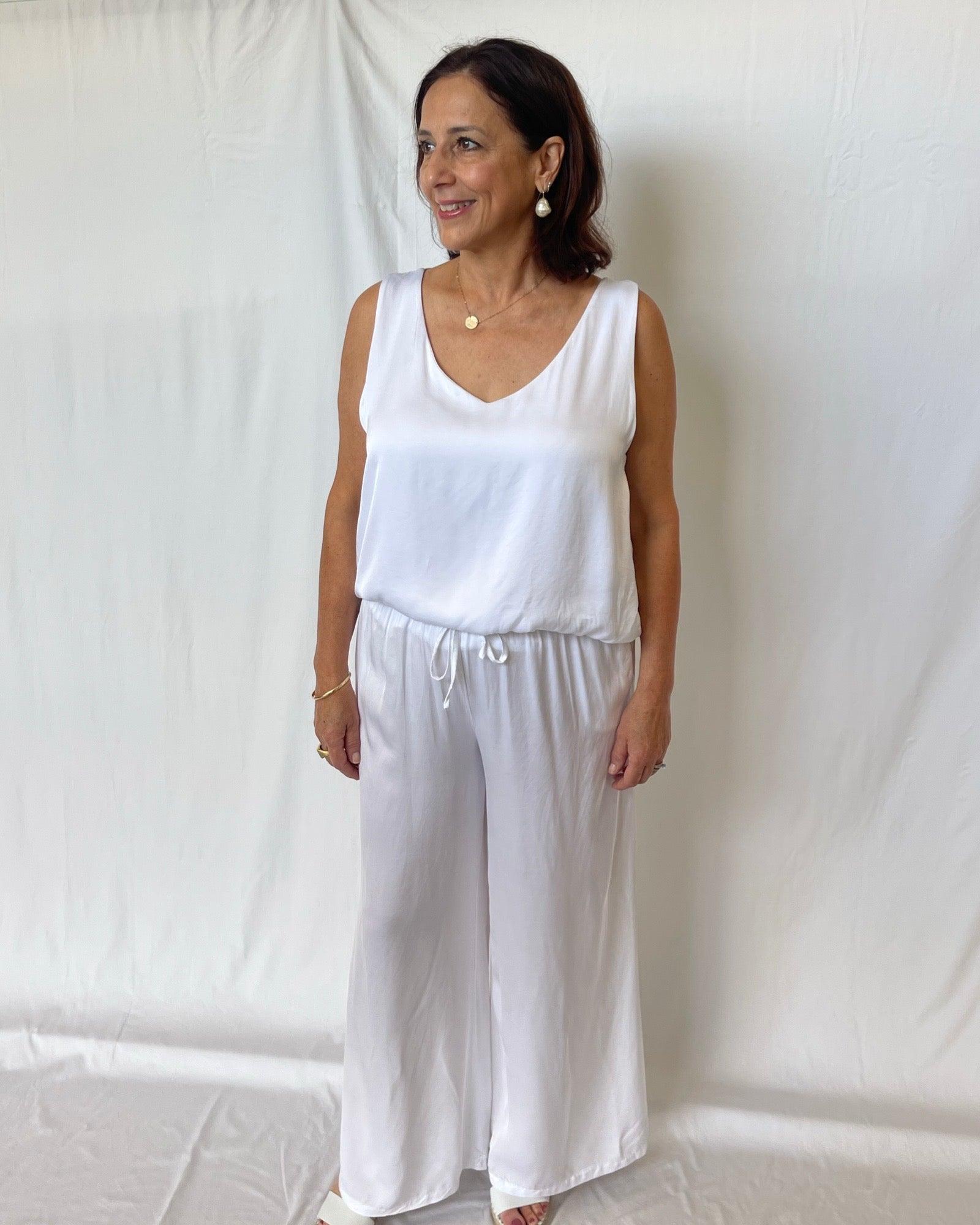 Introducing the Silk Blend Pant in White, a luxurious addition to your wardrobe. This stylish pant features a relaxed fit and an elasticated waist for comfort. With side pockets and made from a light weight fabric with glossy finish. Pair with the Silk Blend Singlet or Amalfi Shirt! Elevate any outfit with this exclusive piece.