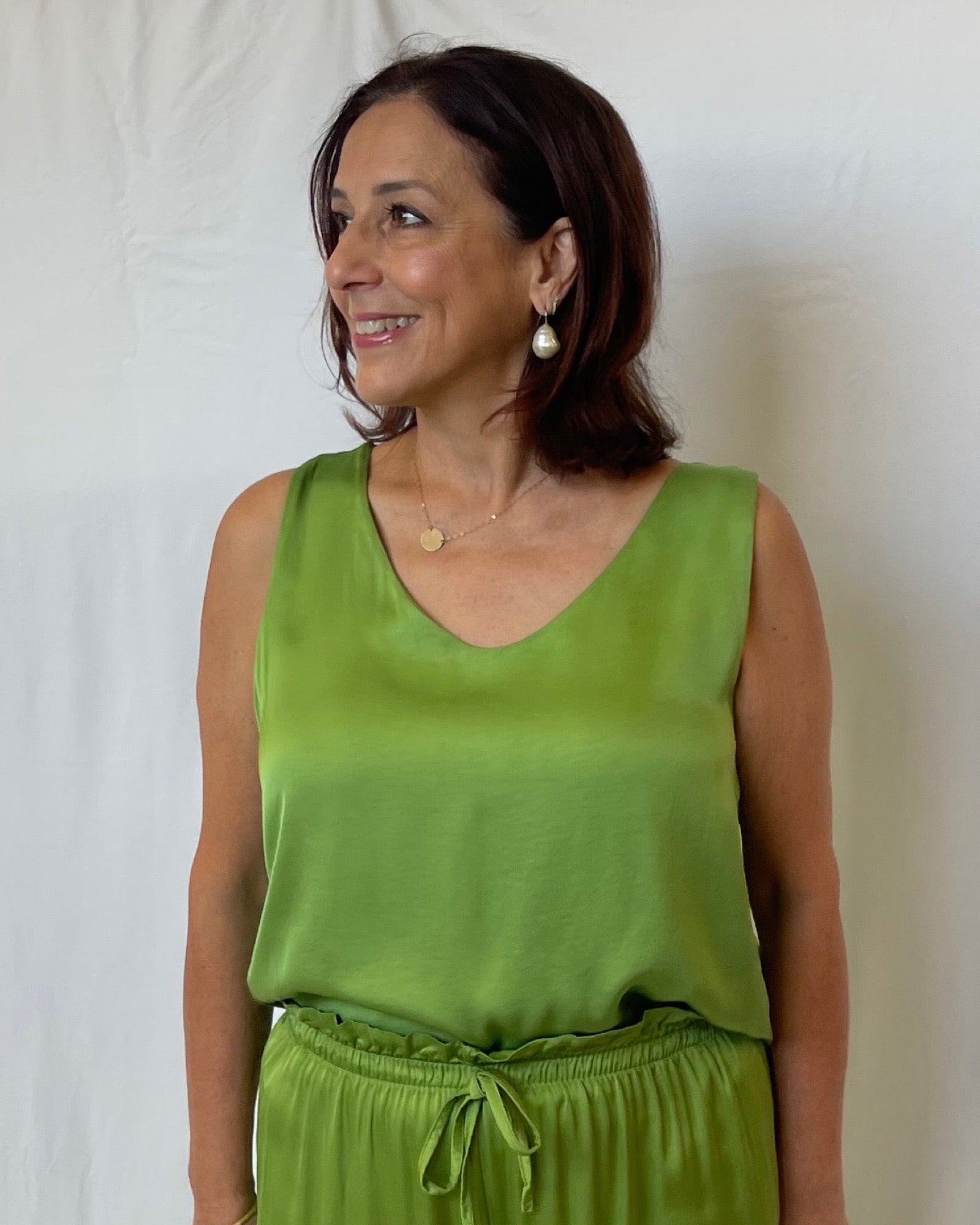 This Silk Blend Singlet in Lime offers a lightweight fabric with a subtle glossy finish, combining comfort with elegance. Its feminine V-neckline enhances a refined silhouette, making it a versatile piece that complements any outfit with sophistication and effortless style.