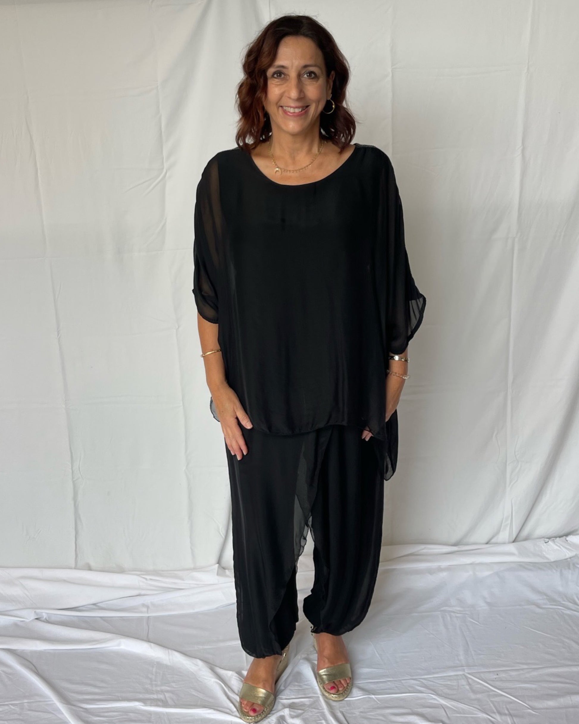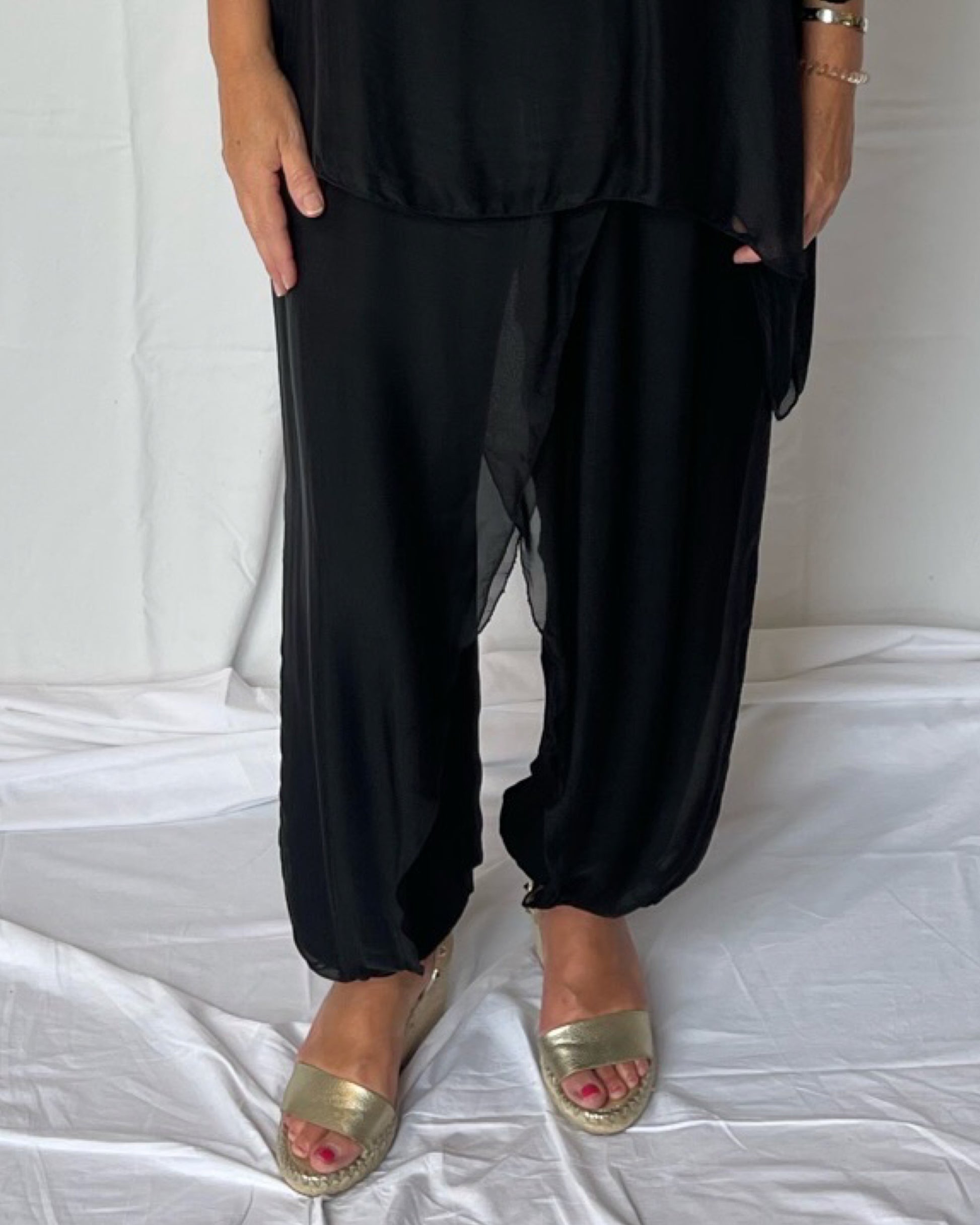 These softley flowing Harem Pant are super comfy & chic. A stylish pant which looks flatering on almost any shape. Featuring a wide jersey soft fabric waist which provides comfort & smaller jersey cuff at ankle. The soft flowing overlay is 70% Silk & 30% Viscose & underlay 95% Viscose & 5% Elasticine.