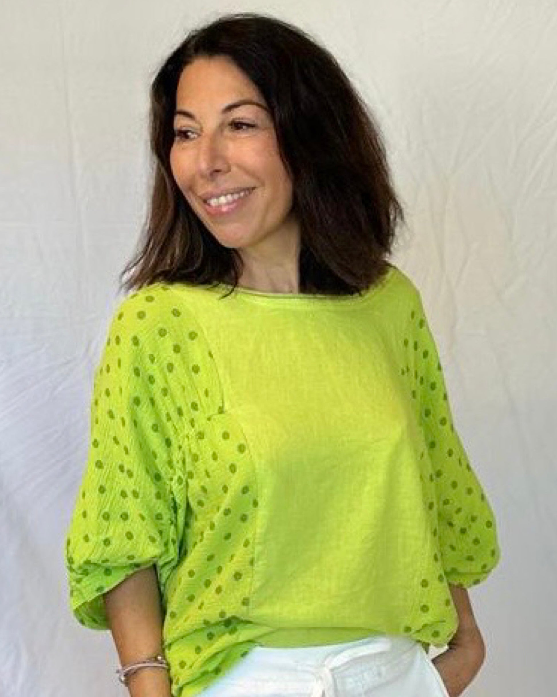 Experience effortless styling and relaxed elegance this summer with the Spot Top. Crafted from a lightweight blend of Linen and Cotton, this statement piece features a relaxed fit, 3/4 length sleeves, and a flattering boat neck. The eye-catching spotted print is available in multiple glorious colours, perfect to pair with white pants for a summery look.