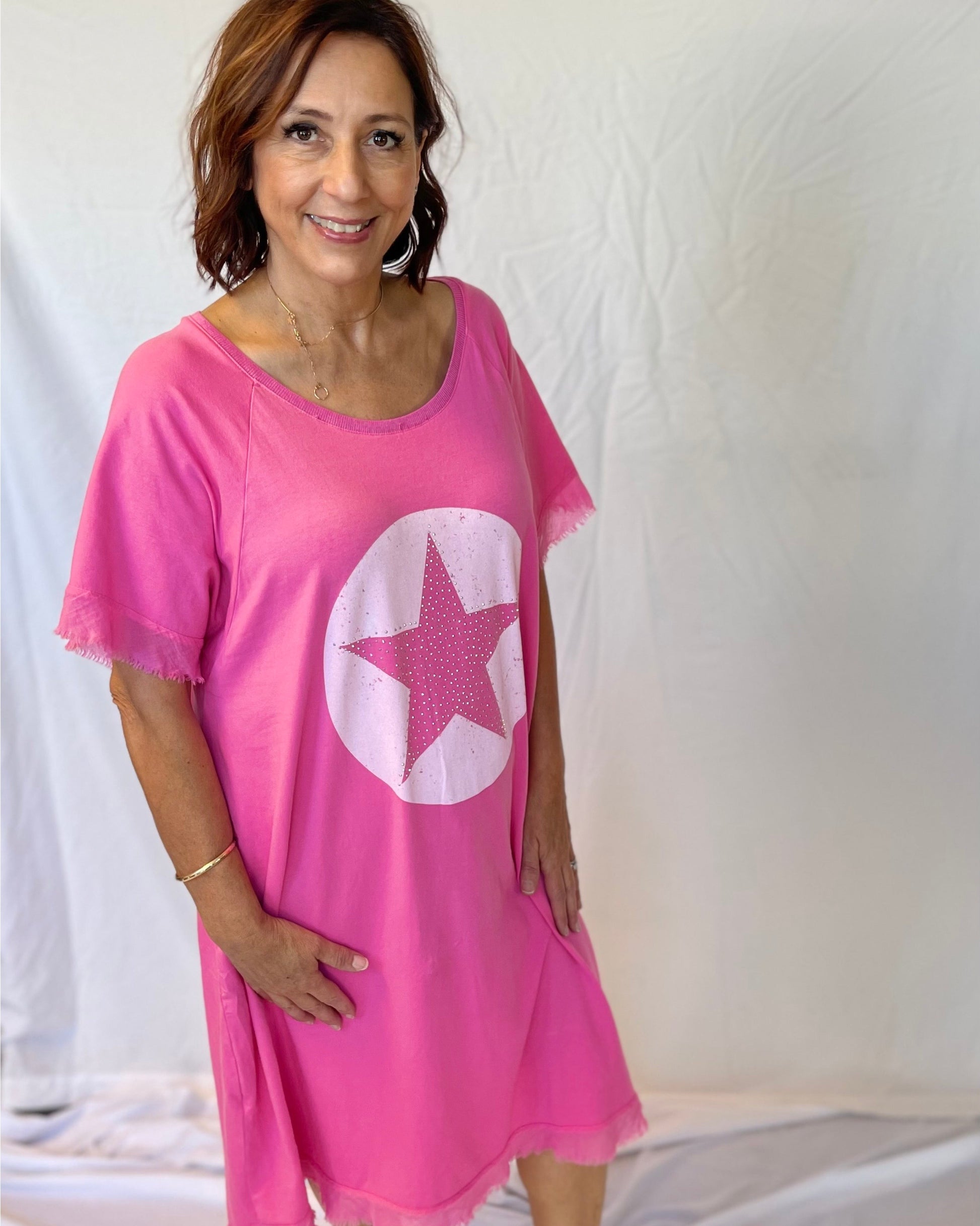 This outta-this-world dress is perfect for hot summer nights! The Star Dress has an easy slip on fit and frayed finishes on the sleeve & hem that gives it an effortless look - plus, it features an adorable star logo on the front! Get ready to shine!
