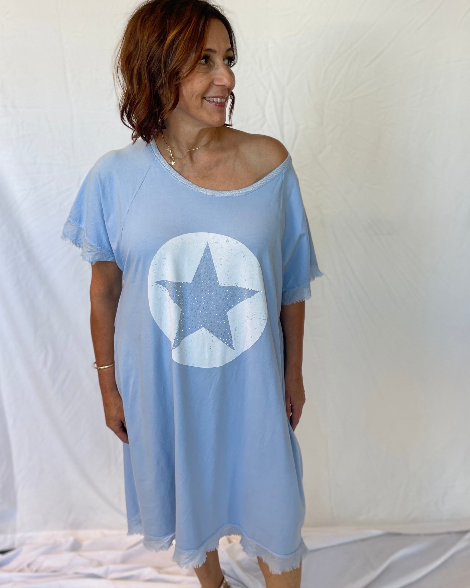 This outta-this-world dress is perfect for hot summer nights! The Star Dress has an easy slip on fit and frayed finishes on the sleeve & hem that gives it an effortless look - plus, it features an adorable star logo on the front! Get ready to shine!