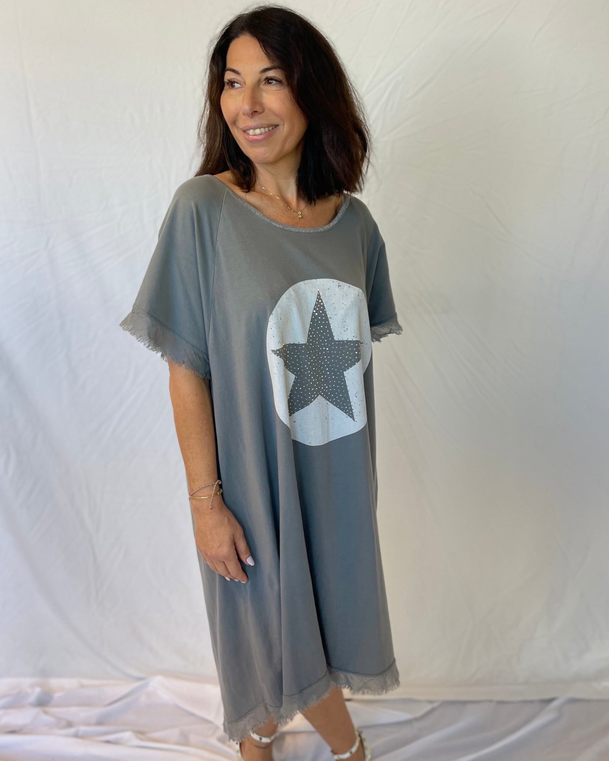 This outta-this-world dress is perfect for hot summer nights! The Star Dress has an easy slip on fit and frayed finishes on the sleeve & hem that gives it an effortless look - plus, it features an adorable star logo on the front! Get ready to shine!
