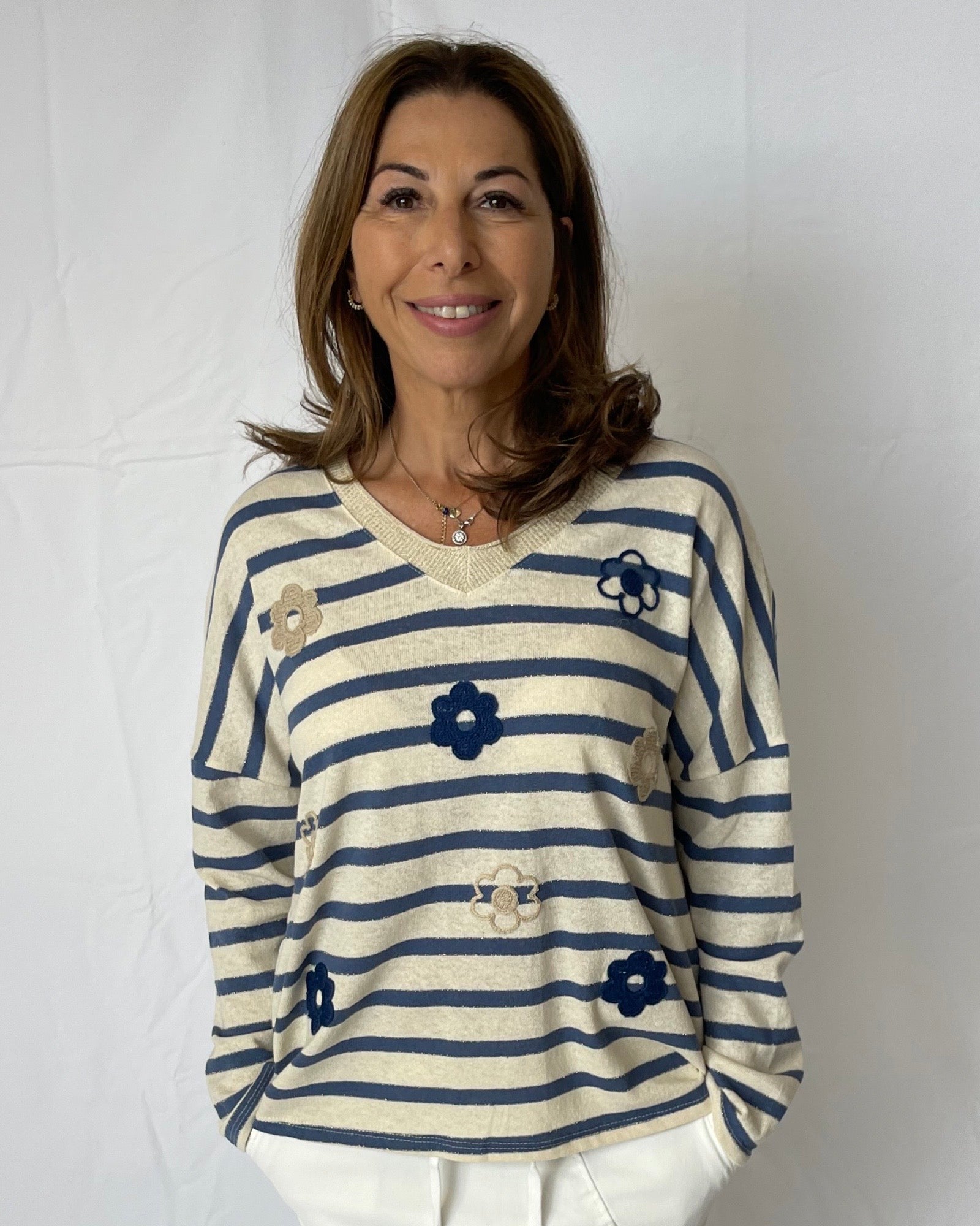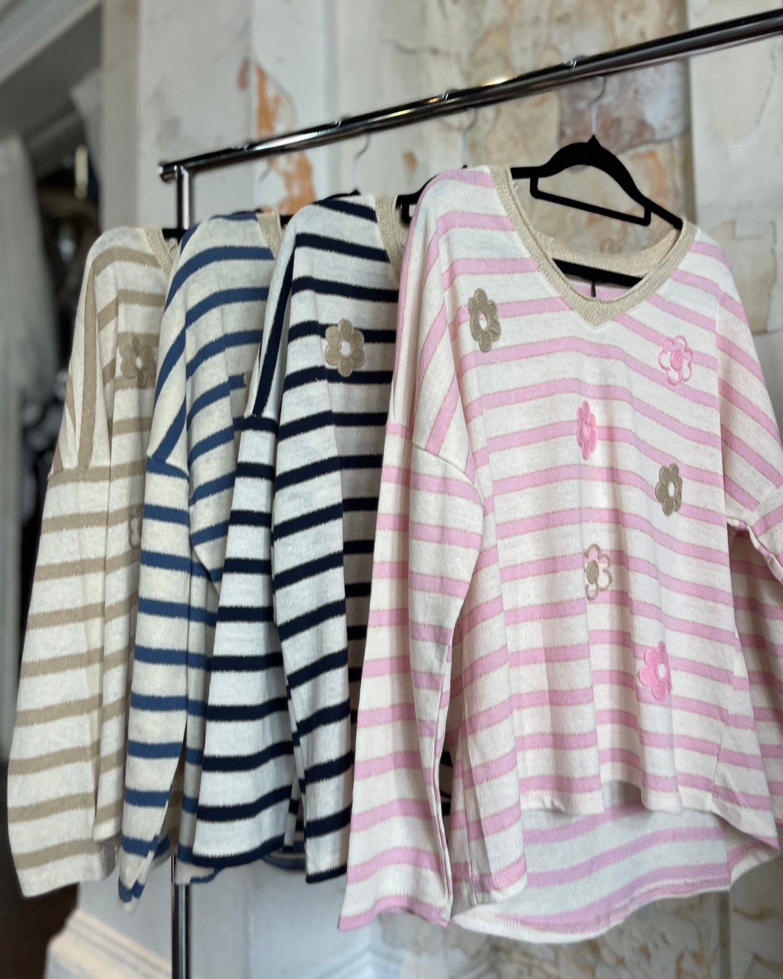 Be fashionably playful in our Striped Flower Knit. This cheerful top is perfect for autumn days and can be layered for cozy winter style. Enjoy the long sleeve design while staying stylish and comfortable.