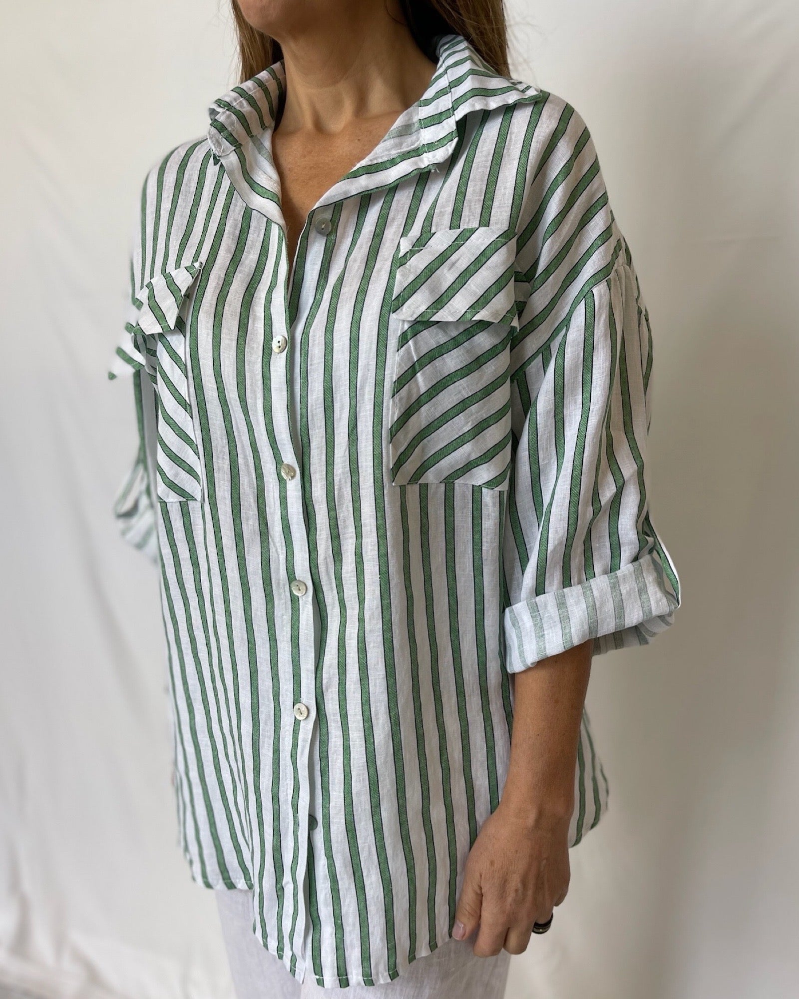 Unleash your daring side with our Stripped Shirt! With a comfortable and cool loose fit, this classic shirt is made from beautiful linen and features a roll-up sleeve with tab for easy movement. Plus, keep your essentials close with the front pockets. Take a chance and add this bold piece to your wardrobe today!