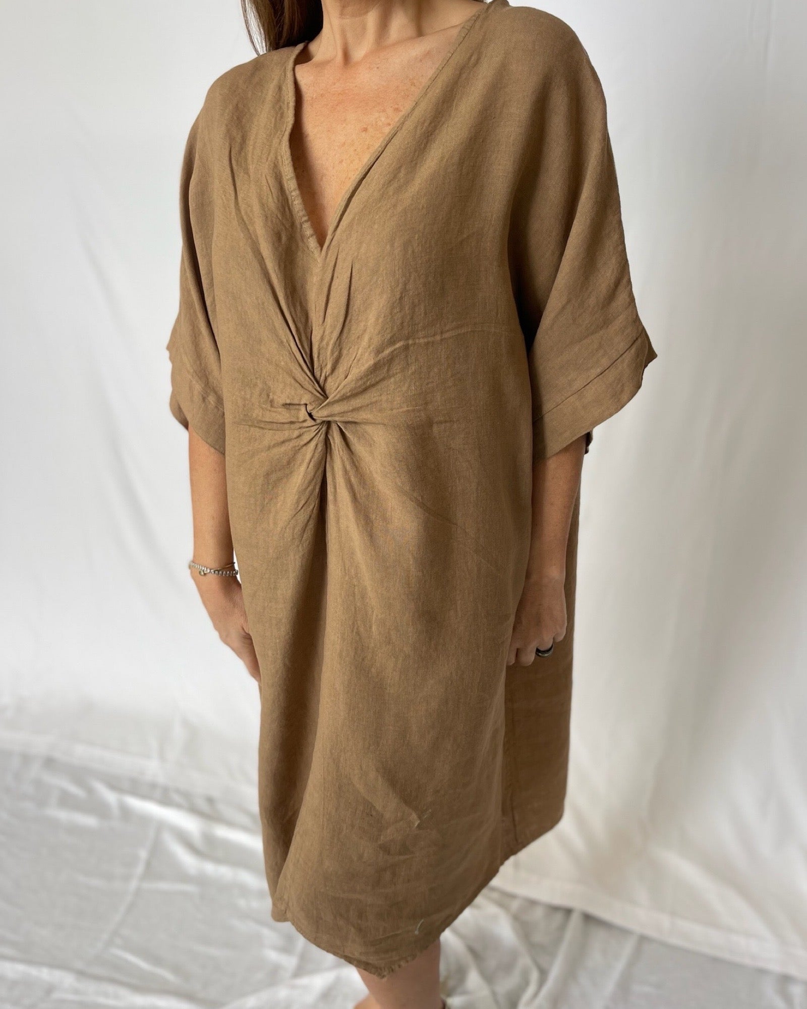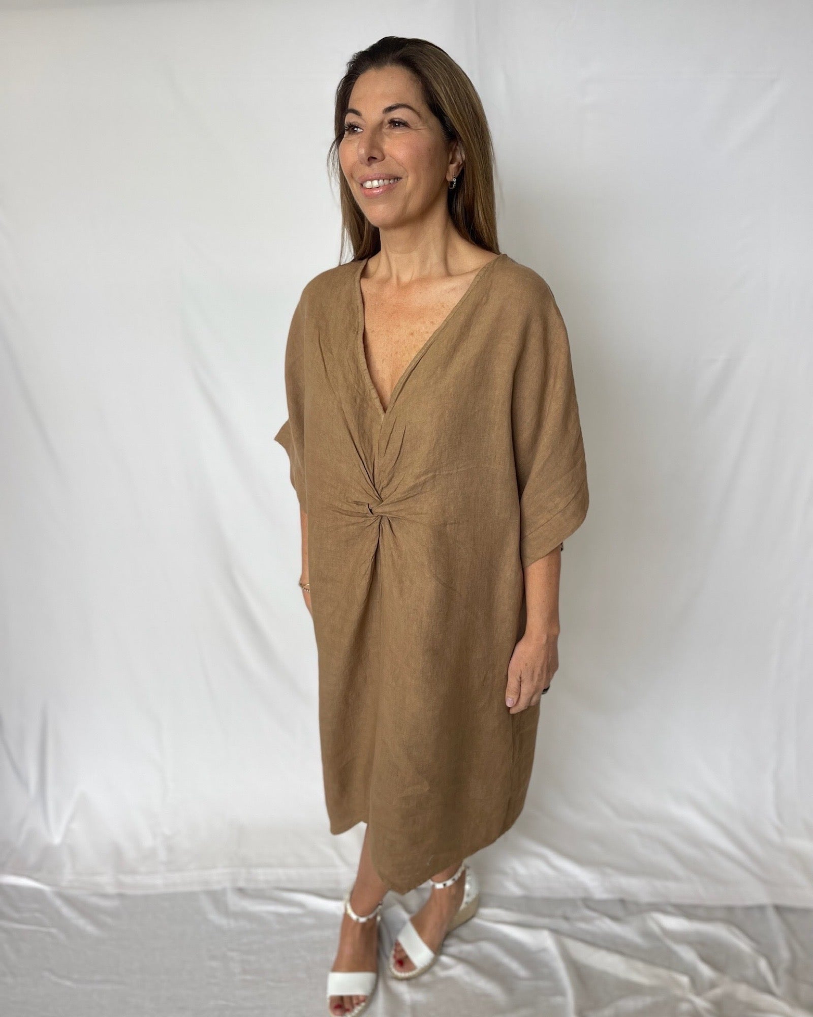 Turn up the heat with our Summer Kaftan Linen! This warm Cocoa coloured kaftan features a unique flare silhouette with a front knot detail, perfect for those who love to take risks and embrace adventure. Its oversized floaty design will keep you feeling cool and looking stylish all summer long.