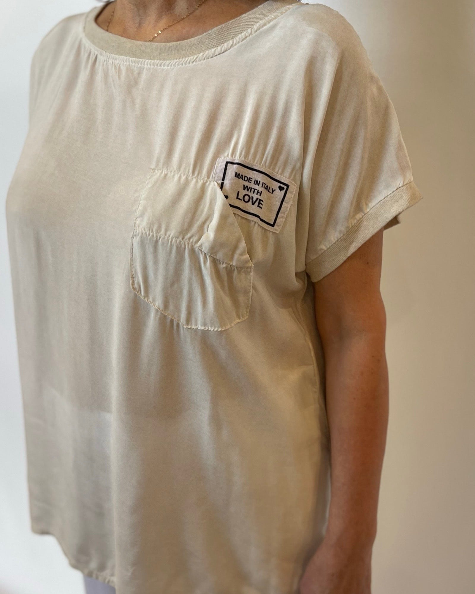 Spread love wherever you go with our With Love Top! This fun tee not only gives off an effortless look, but also features a pocket with the playful phrase "Made In Italy With Love". The round neck and slightly open back with ties add a touch of quirkiness to this top. Made with love just for you!