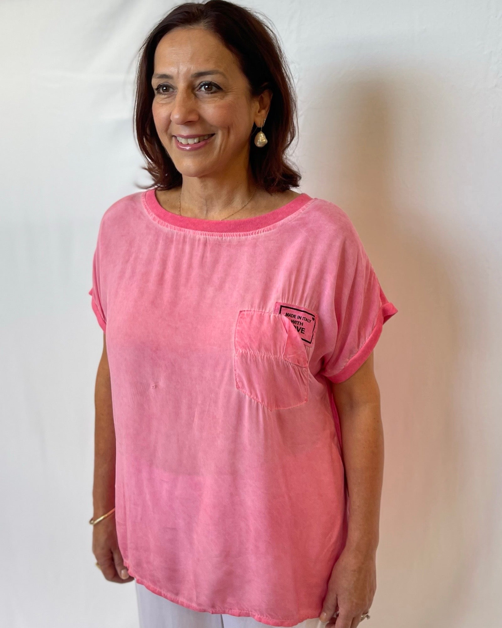 Spread love wherever you go with our With Love Top! This fun tee not only gives off an effortless look, but also features a pocket with the playful phrase "Made In Italy With Love". The round neck and slightly open back with ties add a touch of quirkiness to this top. Made with love just for you!